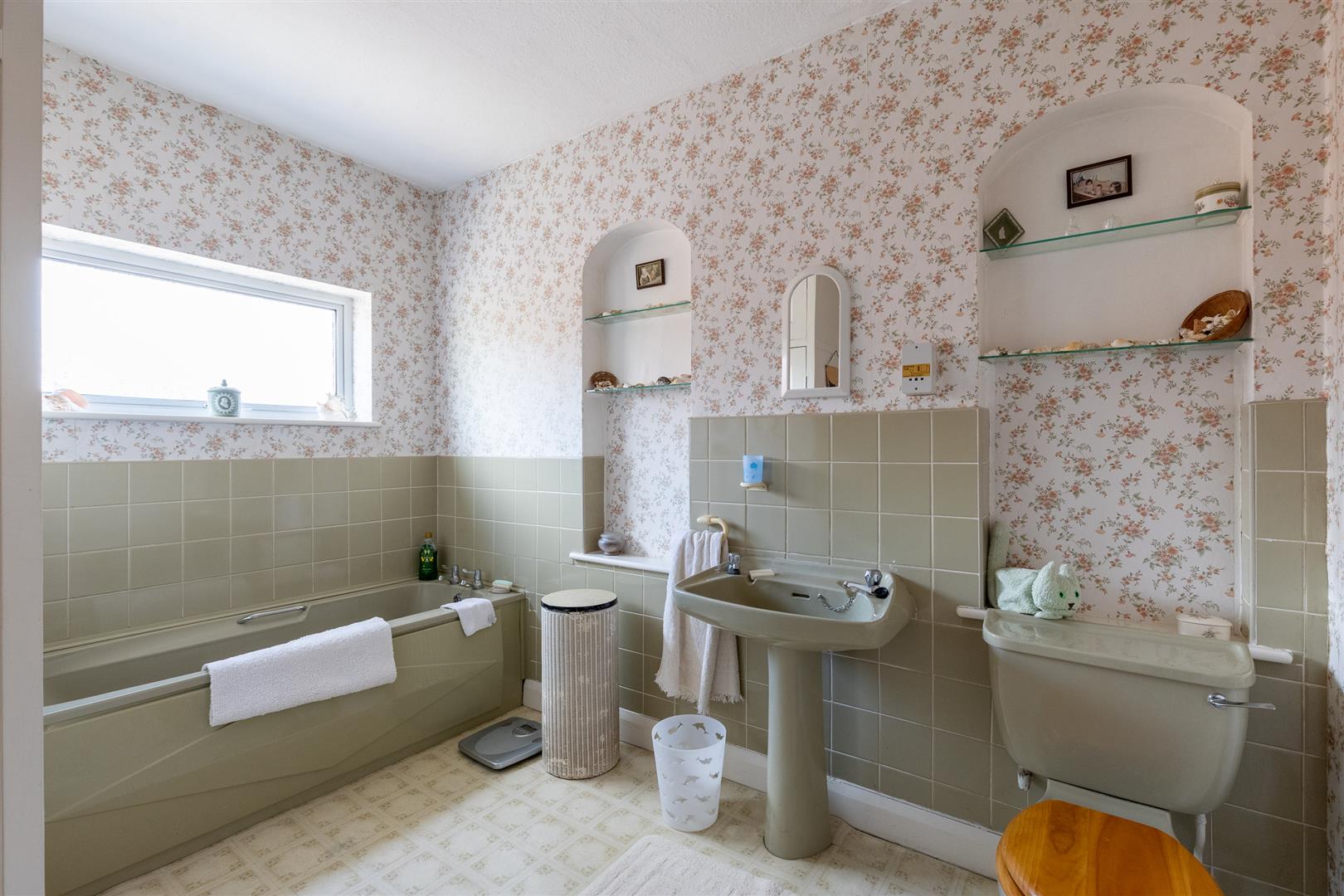 Dimensions: 3.28m x 2.54m (10'9" x 8'4"). Coloured suite comprising low flush W/C, pedestal hand basin and panel bath, cylinder and airing cupboard, two inset display shelves, access to loft, radiator.