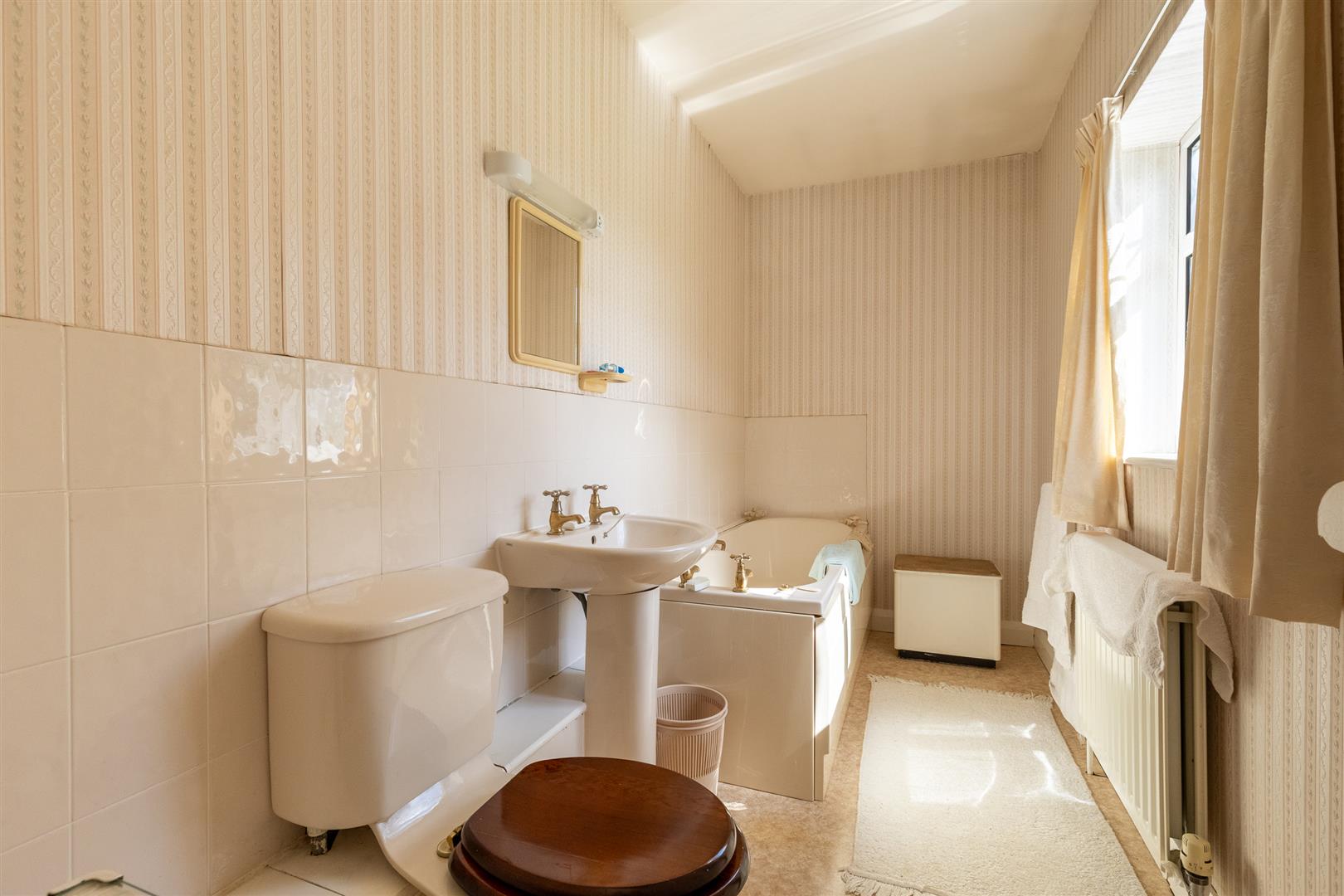 Dimensions: 3.51m x 1.47m (11'6" x 4'10"). Coloured suite comprising panel bath, pedestal hand basin, low flush W/C, part tiled walls, radiator.