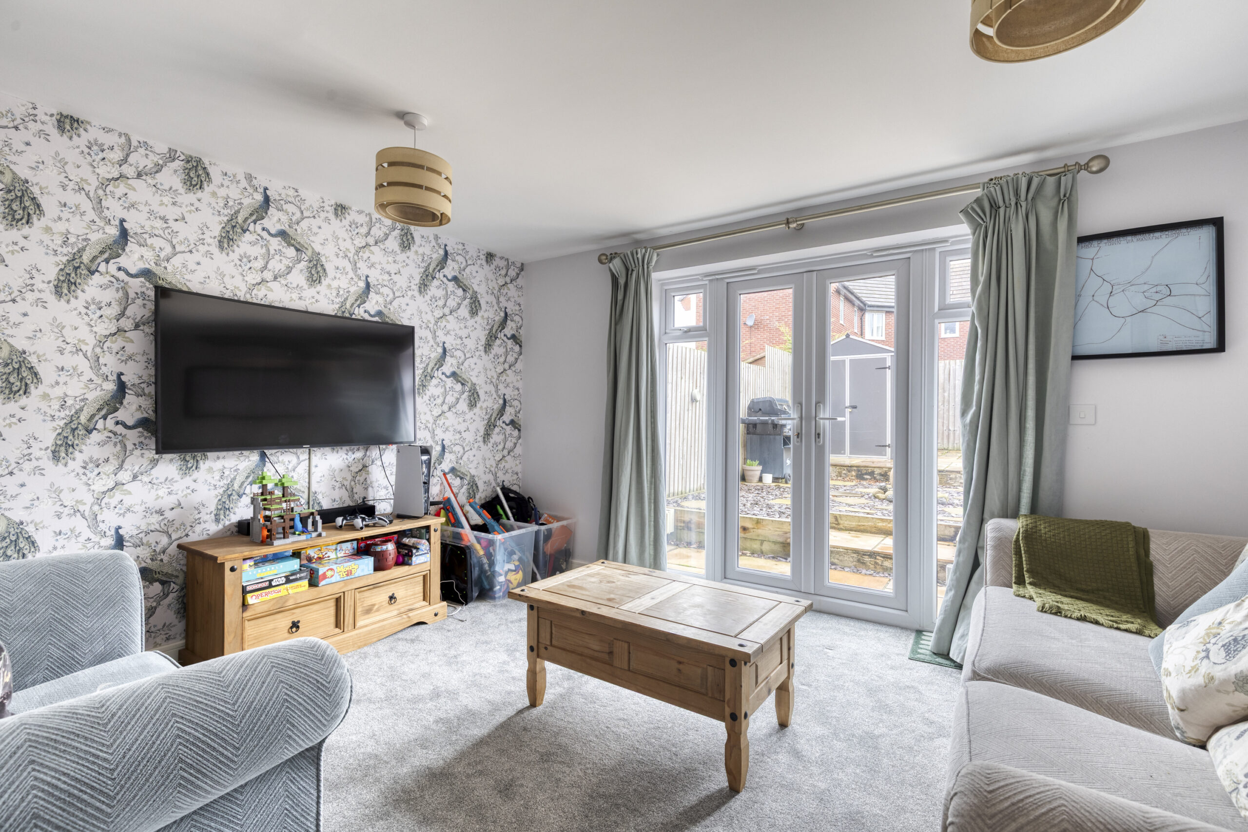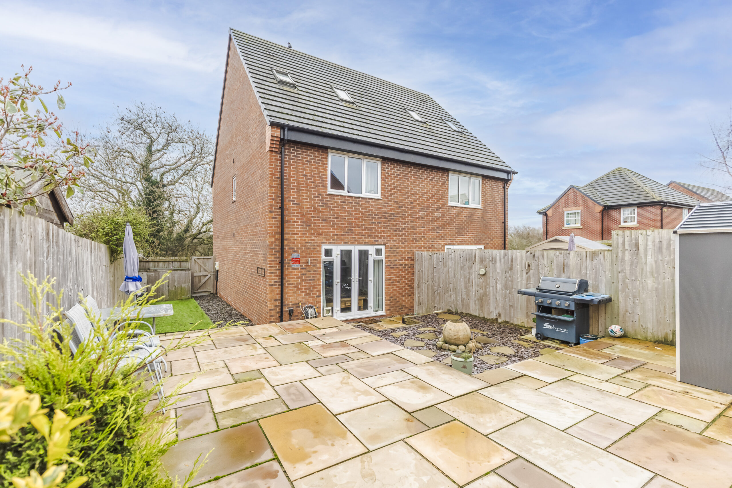 Driveway with shared approach, providing off-road parking for approximately three cars. Rolex electric car charging point. Astro to side, slate path Upper and lower terraced patio area Single external power point and cold-water tap Water feature Westerly facing rear garden Close boarded boundary fences Open front aspect