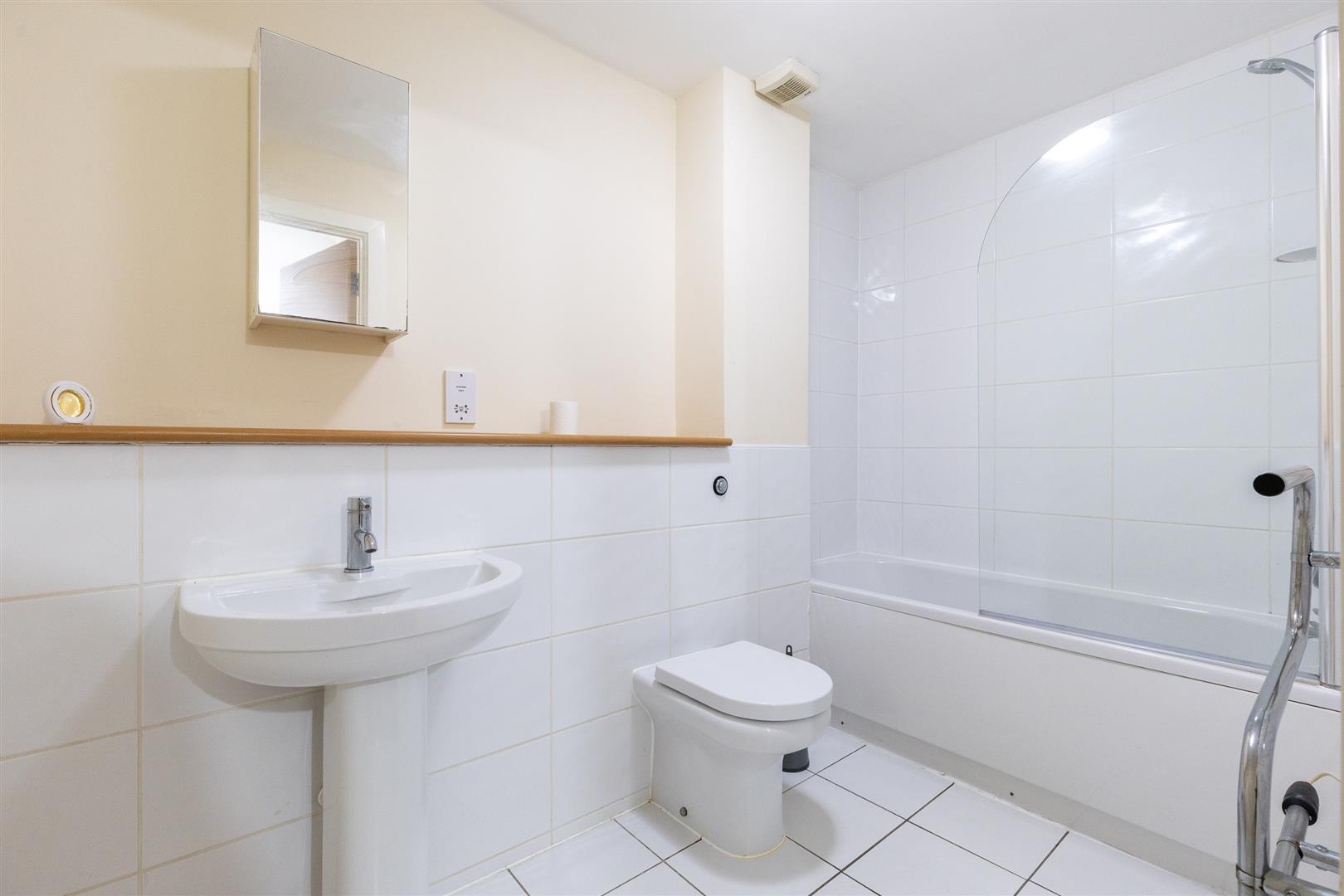 Dimensions: 2.84m x 1.68m (9'4" x 5'6"). White suite comprising panel bath with mixer shower, low flush W/C and pedestal hand basin, tiled floor, shaver point, bathroom cabinet with mirrored door, fully tiled around bath, electric towel rail.