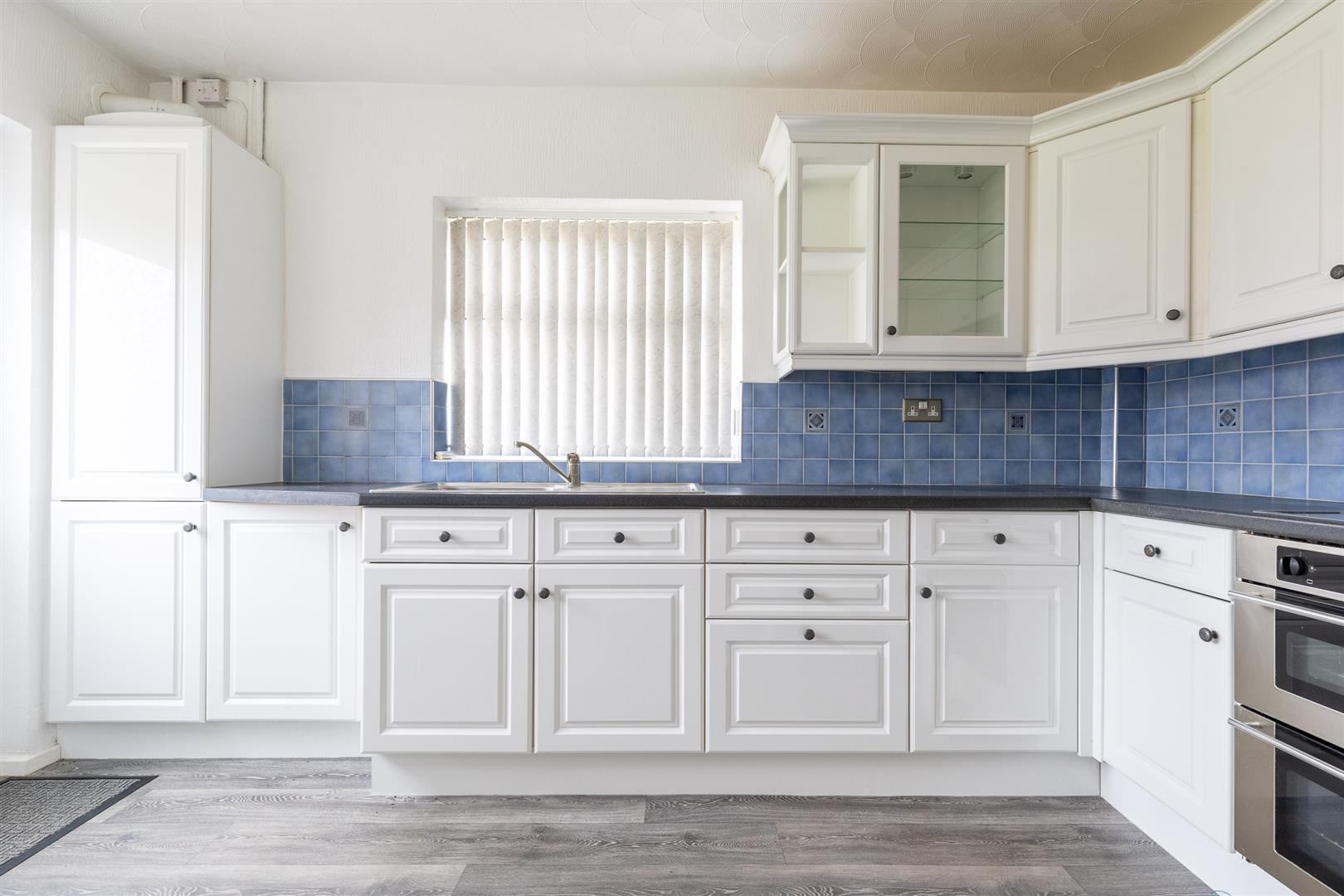 Dimensions: 3.86m x 2.69m (12'8" x 8'10"). Modern white fronted units to four elevations, base storage and drawer units with wall mounted cupboard and shelving, worktop surfaces with stainless steel sink unit (single drainer, two uPVC double glazed windows and exterior door, vinyl floor covering, part tiled walls, Worcester gas fired boiler, fitted appliances include:- Double electric oven and grill, ceramic electric hob with canopy hood over, understairs position housing plumbing for washing machine.
