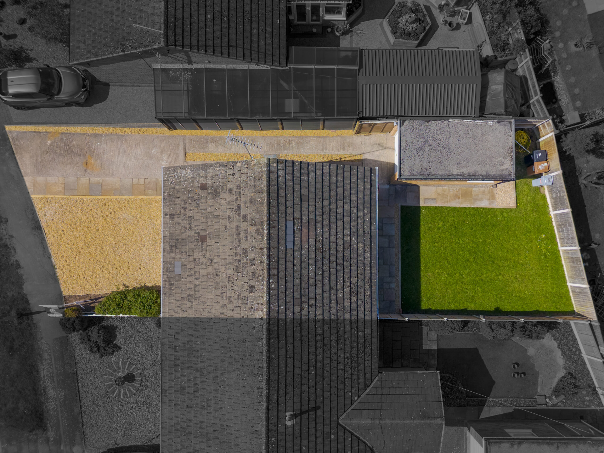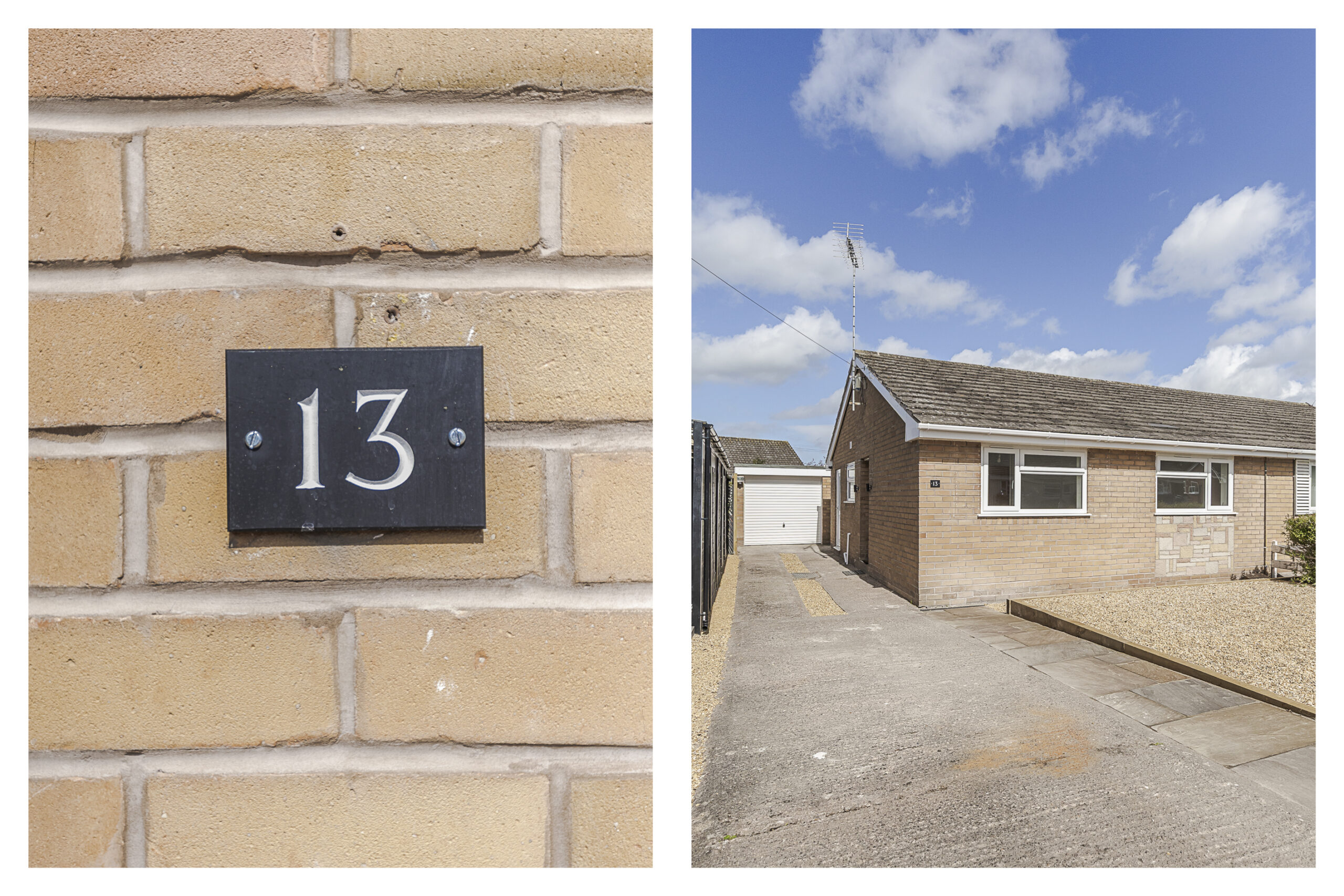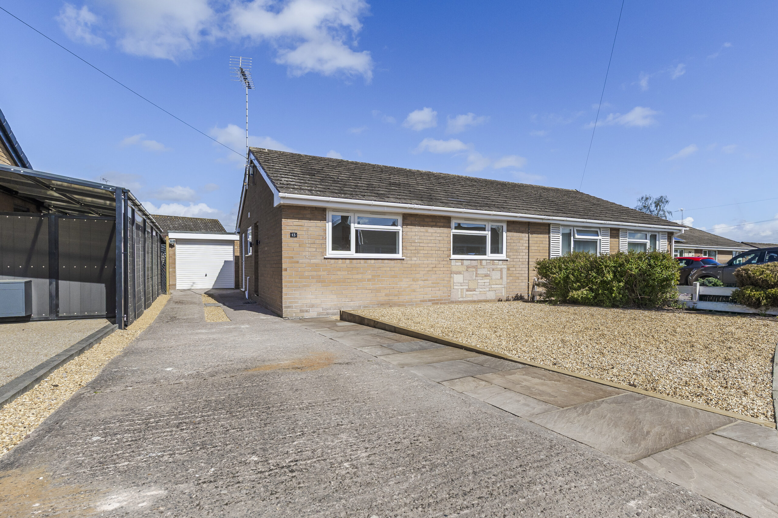 The front driveway provides parking for at least three cars and leads to the detached single brick built garage.