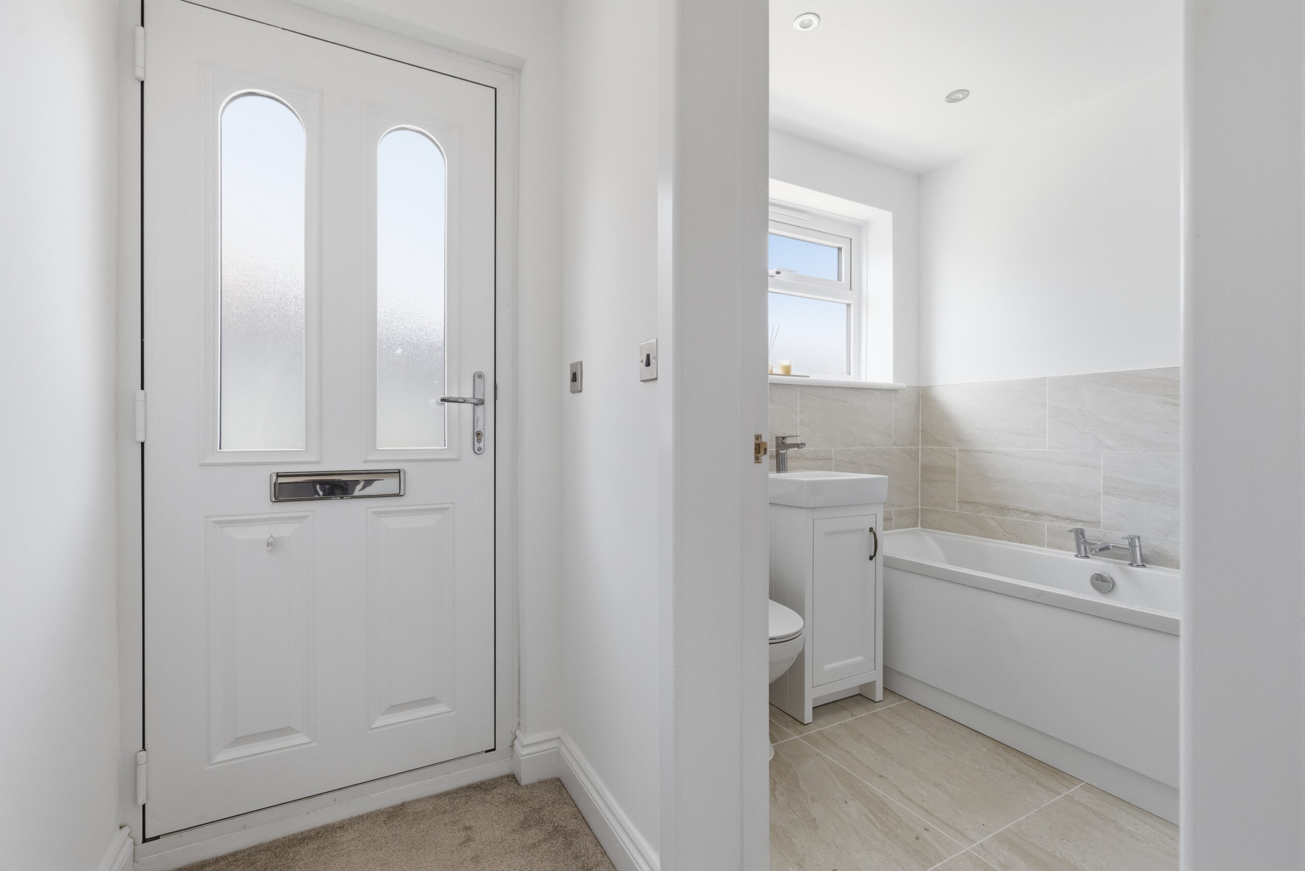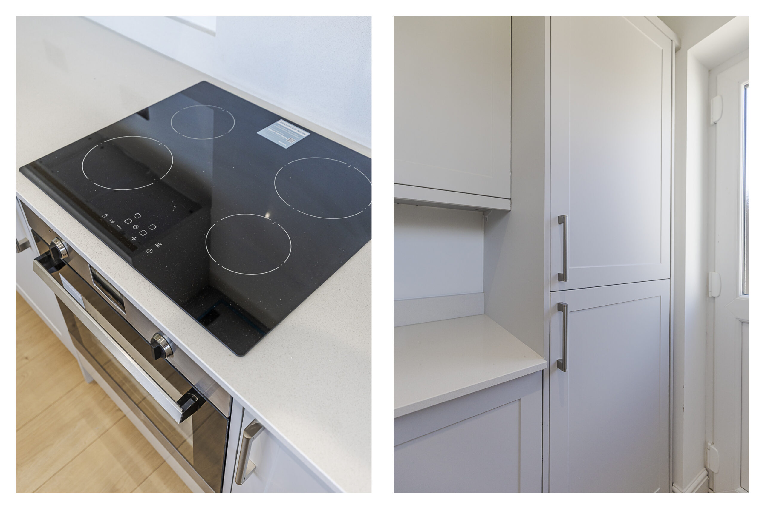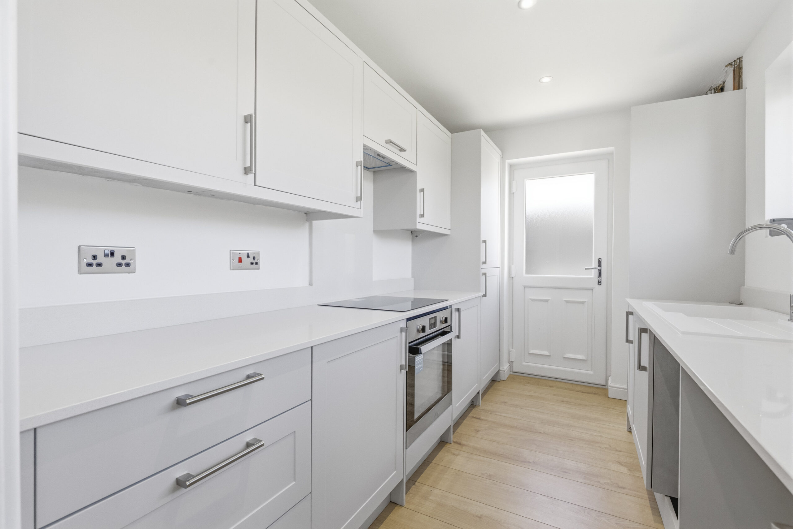 Tastefully appointed with a brand-new kitchen comprising a range of wall and base units incorporating cupboards and drawers with work surfaces over. There in an inset induction hob with extractor hood over and single oven under. There is an integrated fridge/freezer, space & plumbing for washing machine and dishwasher. There are two windows to the rear, recessed ceiling spotlights and wood style flooring fitted. Door leading to the driveway.