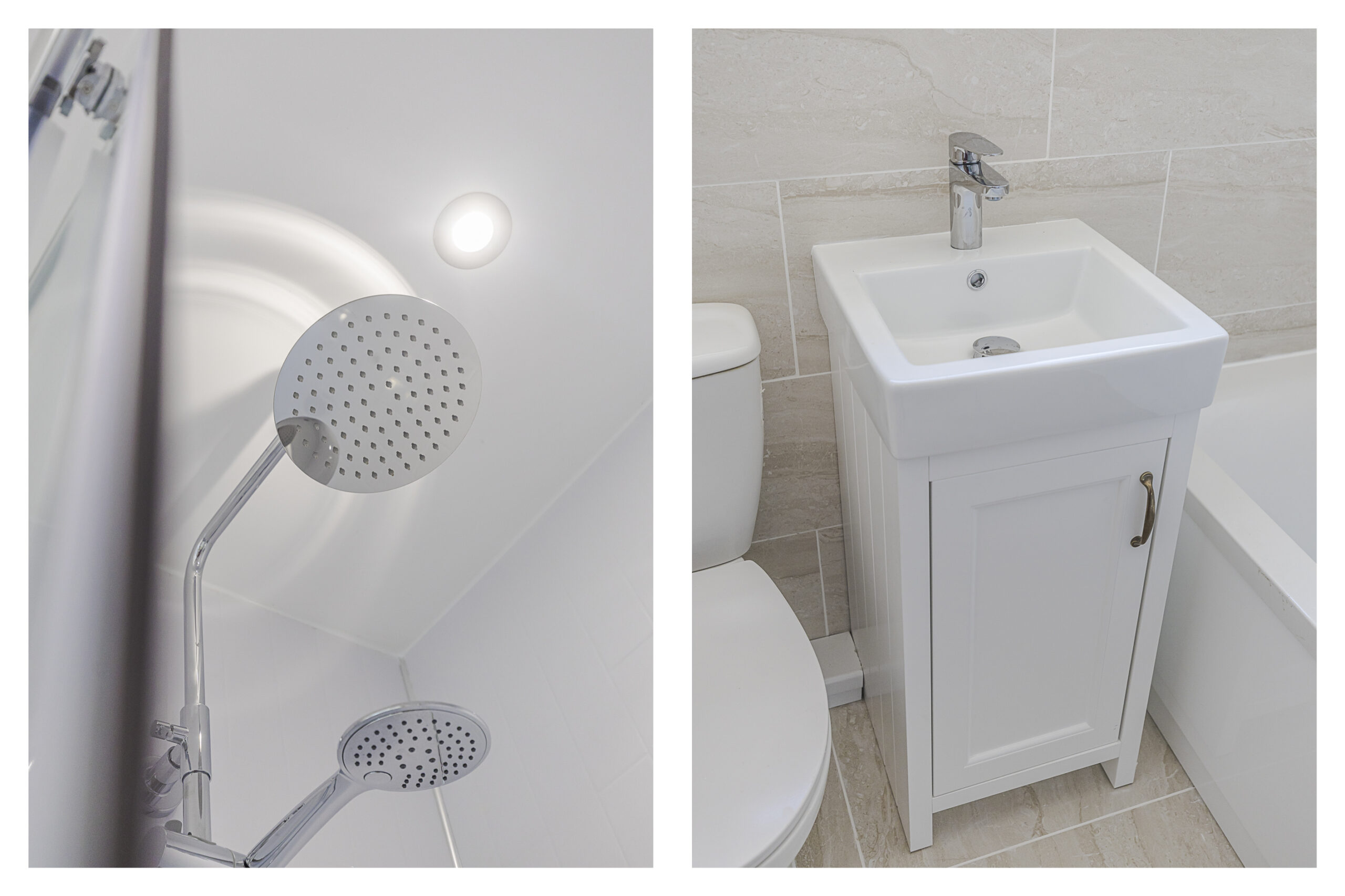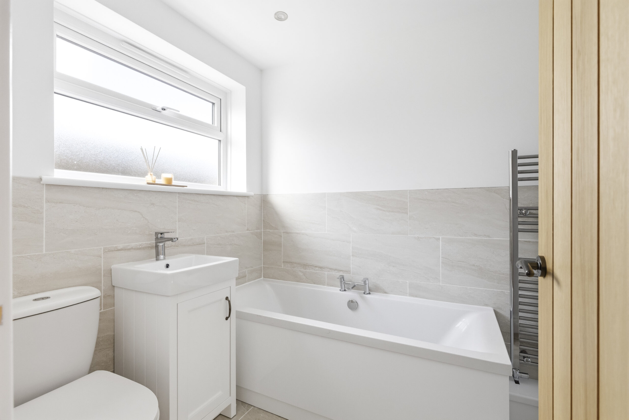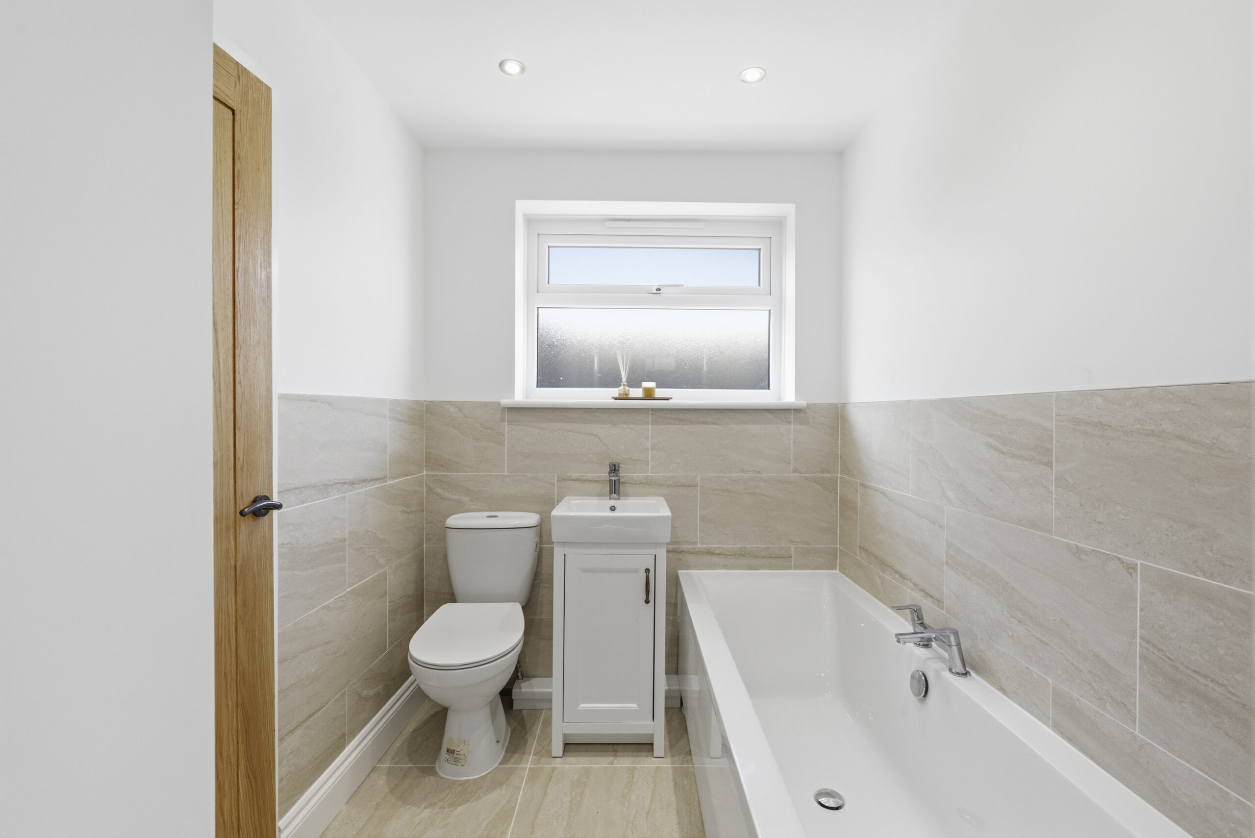 Tastefully appointed with a brand-new kitchen comprising a range of wall and base units incorporating cupboards and drawers with work surfaces over. There in an inset induction hob with extractor hood over and single oven under. There is an integrated fridge/freezer, space & plumbing for washing machine and dishwasher. There are two windows to the rear, recessed ceiling spotlights and wood style flooring fitted. Door leading to the driveway.