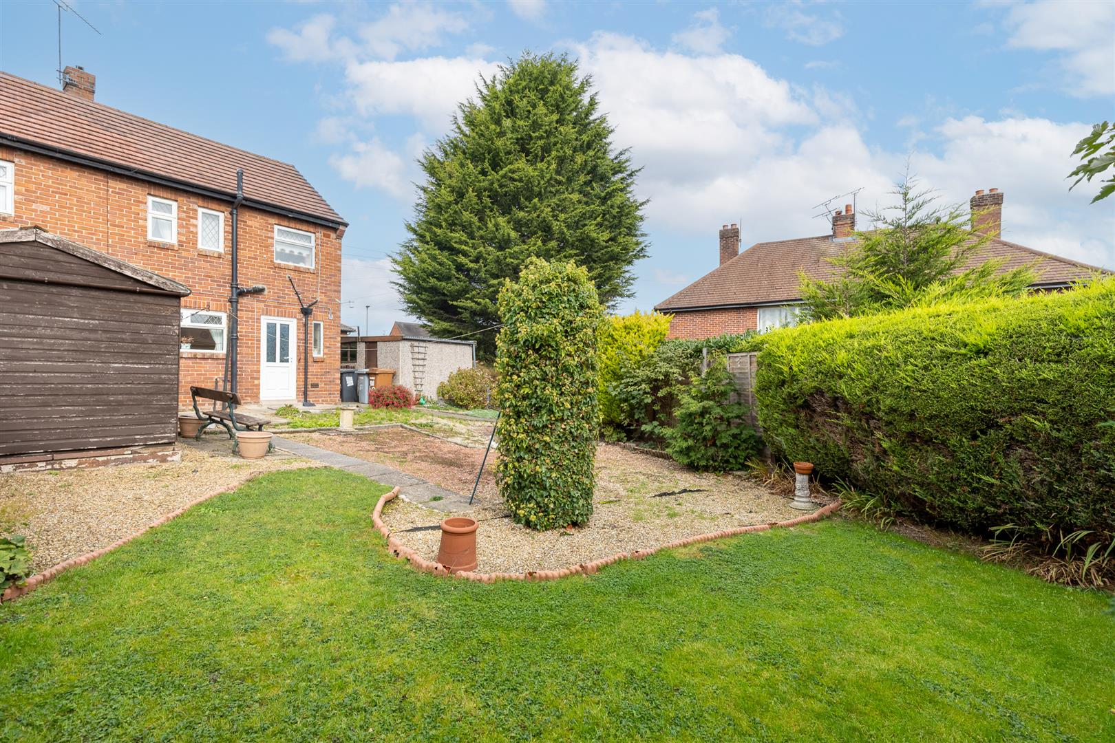 See attached plan. Off road parking - paved and stoned driveway, pre cast single garage 18'1" x 9'3", front and rear lawned gardens, mature trees and bushes, timber garden shed, paved patio area and pathways, South Easterly facing rear garden.