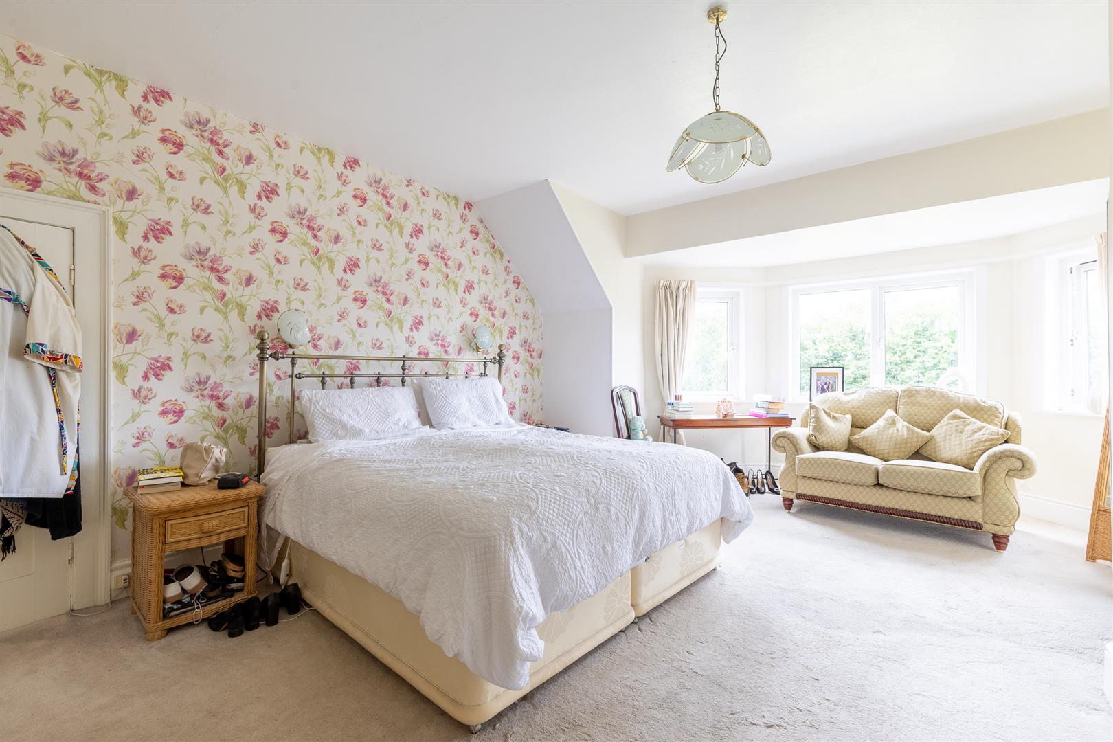 Bedroom One with carpeted flooring, radiator, three front-facing double glazed windows overlooking green space, and walk-in wardrobe area. Bedroom Two with carpeted flooring, radiator, ceiling cornices, wall lights, ceiling light fitting and rear-facing window. Bedroom Three with carpeted flooring, light fittings and side-facing double glazed window.