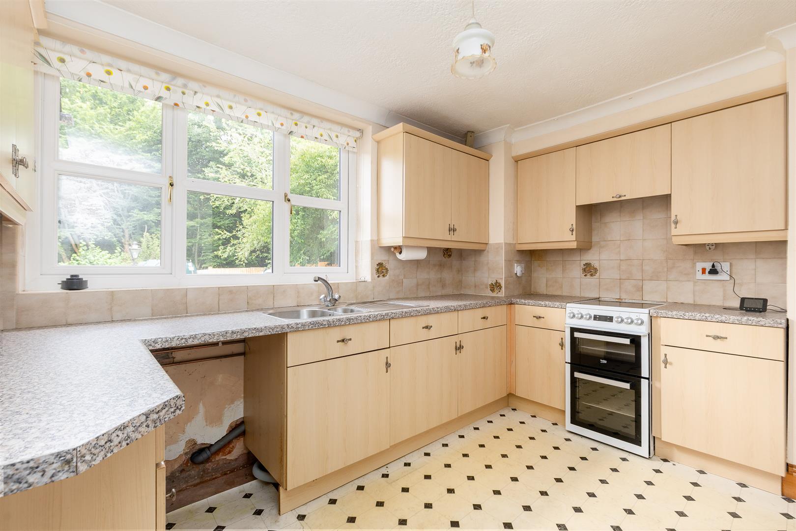 Dimensions: 4.22m x 3.53m (13'10" x 11'7"). Stainless steel one and half bowl single drainer sink unit, cupboard under, floor standing cupboard and drawer units with worktops, wall cupboards, Beko cooker with extractor hood above, built in cupboards, single wall light.