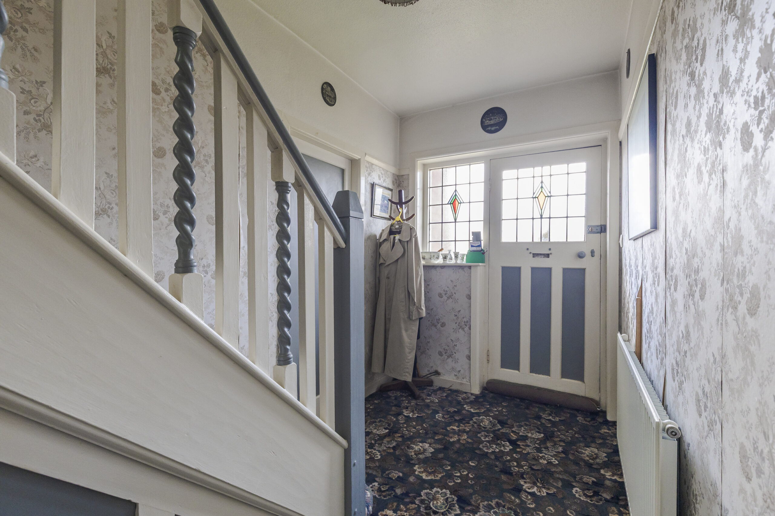 Entrance door with stained glass top light, stained glass window to side, understairs store.