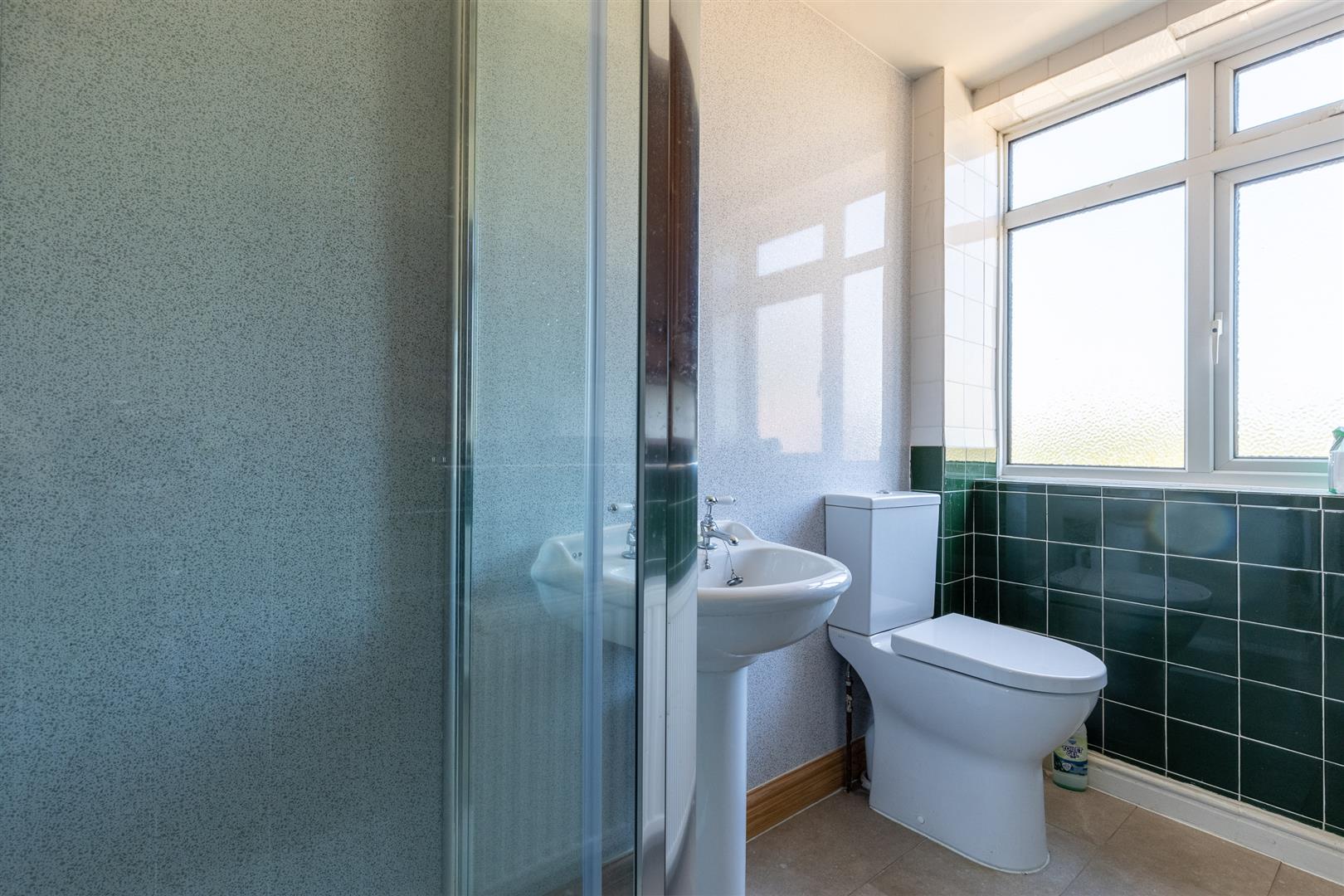 Dimensions: 3.45m x 1.78m (11'4" x 5'10"). White suite comprising pedestal hand basin and low flush W/C, shower cubicle with Triton shower, radiator.