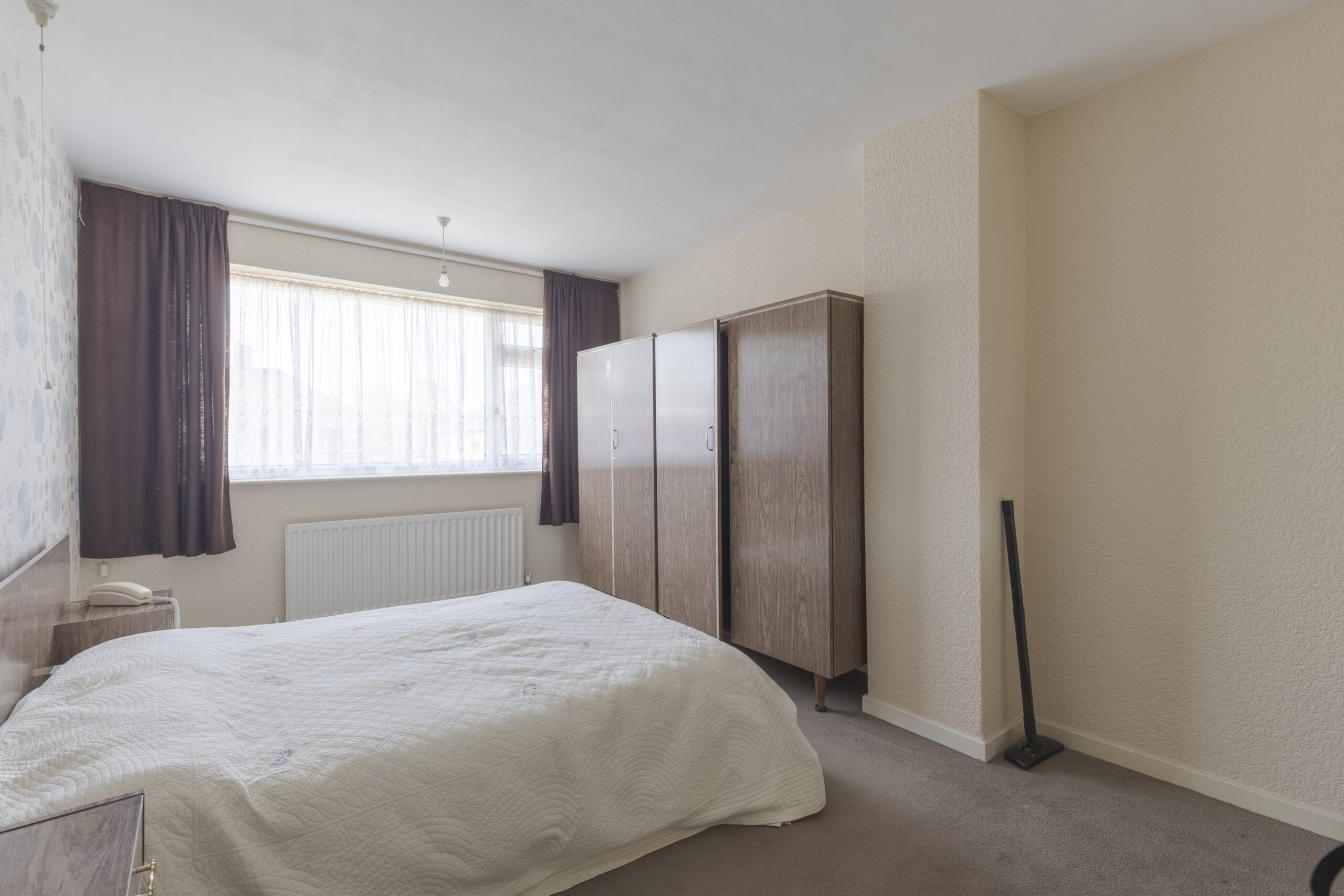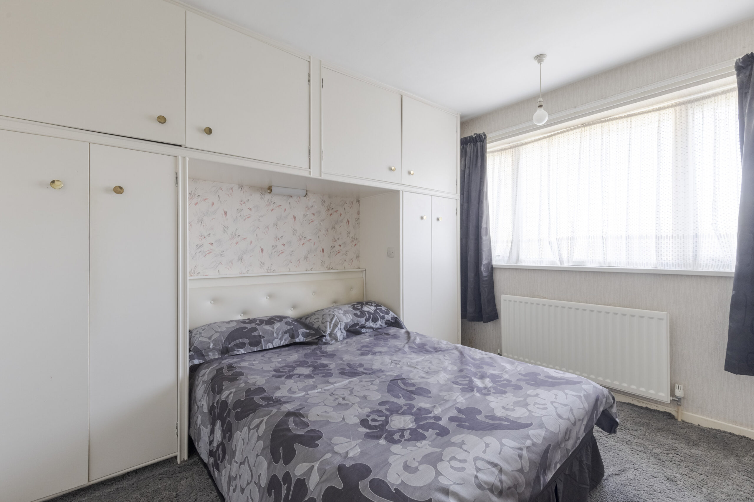 Fitted wardrobes with cupboard above.