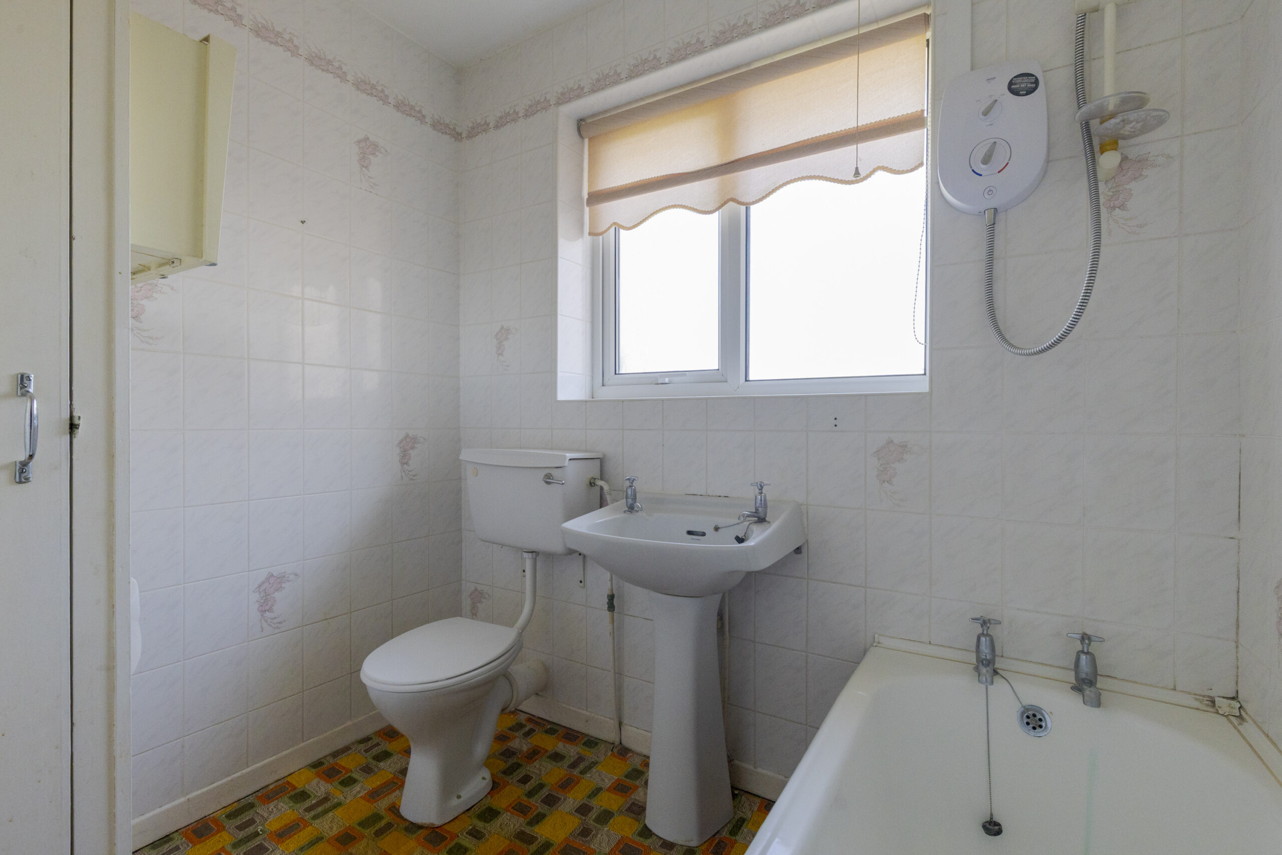 White suite comprising panel bath with Mira shower over, pedestal hand basin and low flush W/C, linen cupboard, part tiled walls.