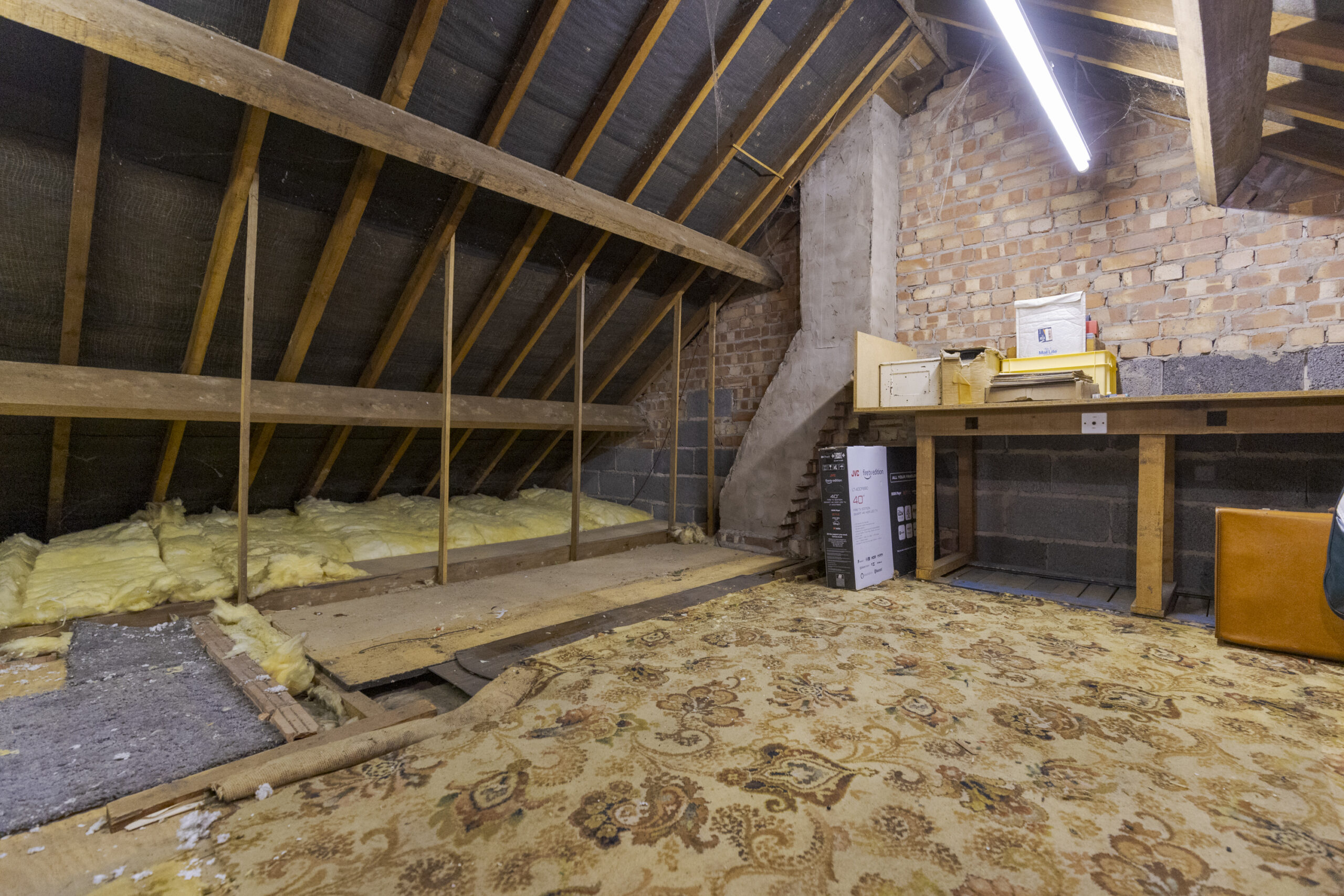 Access via Slingsby type ladder to large roof space with full ceiling height, boarded floor, light and Worcester gas fired combination boiler.