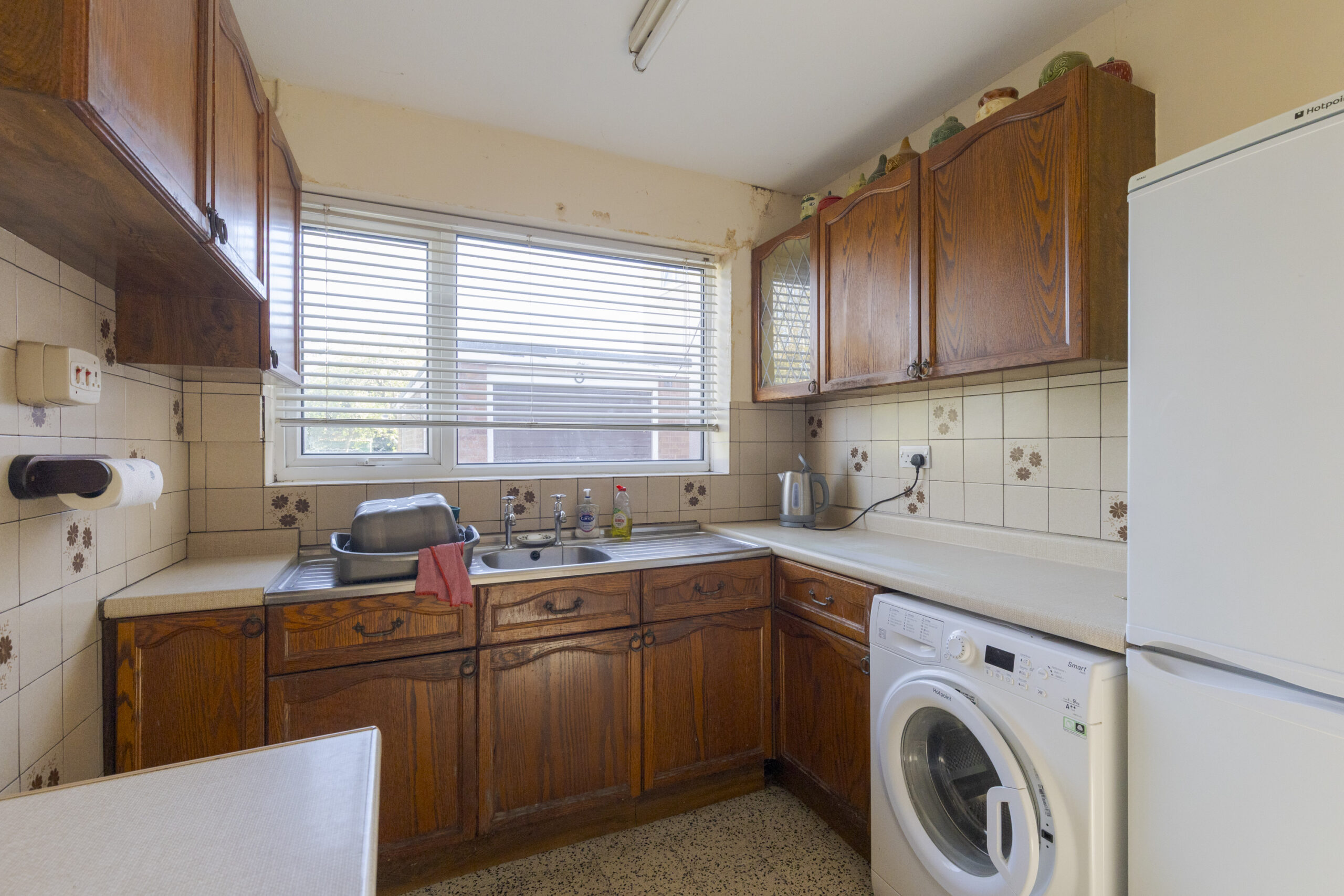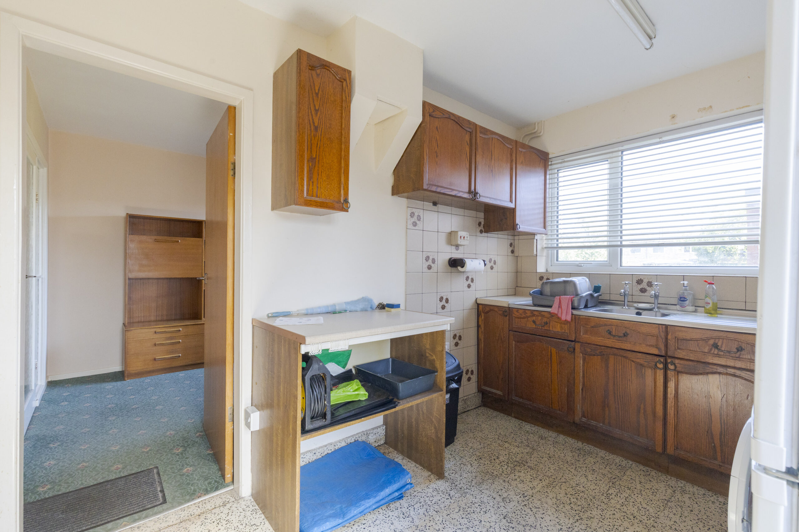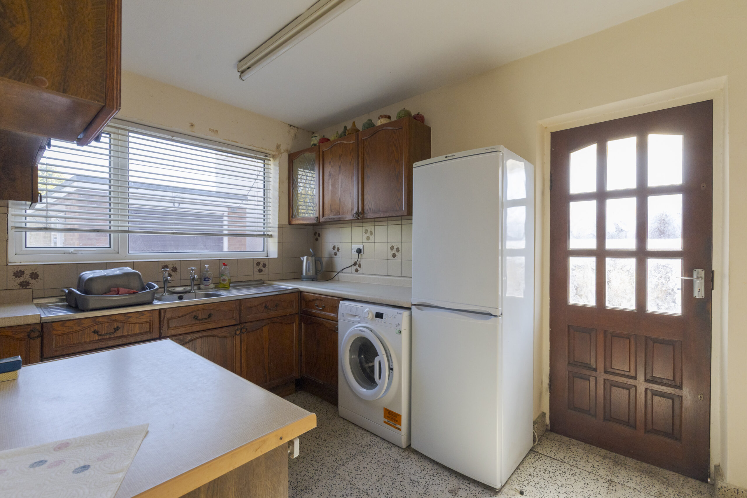 Stainless steel sink unit, cupboards under, wall cupboards, door to side, plumbing for washing machine, built in pantry cupboard, door to side, terrazzo tiled floor.