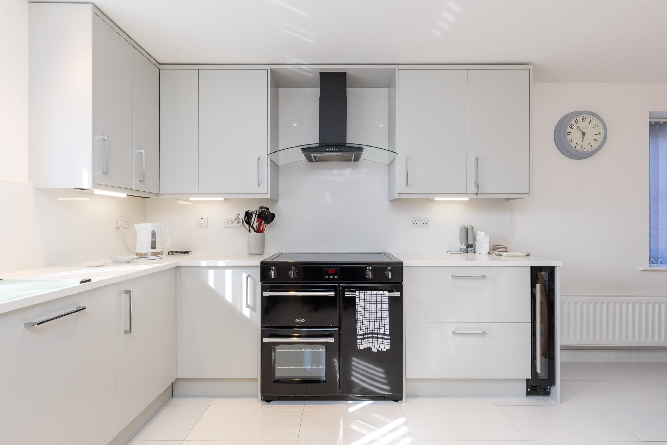 Dimensions: 5.56m x 3.68m (18'3" x 12'1"). Fitted in 2024. An excellent range of bespoke units comprising of floor standing cupboards and drawers, Quartz worktops, inset stainless steel sink unit, caracul cupboards, bin store, wall cupboards, Belling Range style cooker with extractor hood above, Hotpoint washing machine, Samsung American style refrigerator, wine cooler, tiled floor, two double glazed windows, radiator.