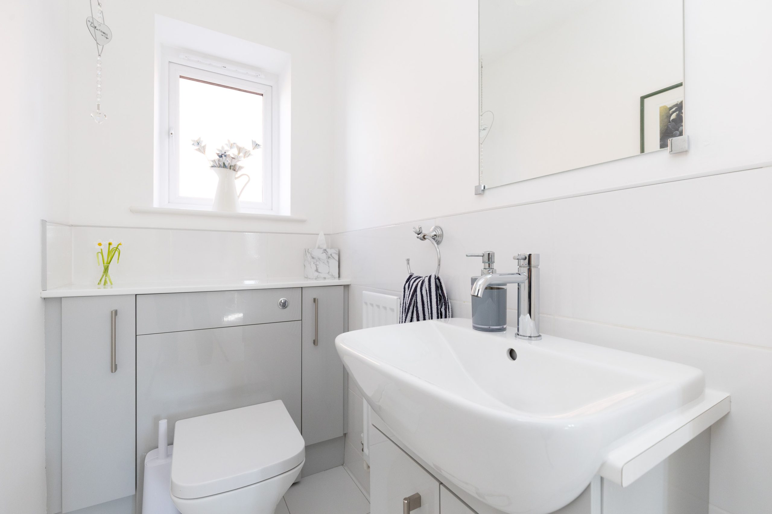 Dimensions: 1.68m x 1.09m (5'6" x 3'7"). Refitted in 2024. White suite comprising low flush W/C, vanity unit with hand basin, part tiled walls, tiled floor, mirror fitting.