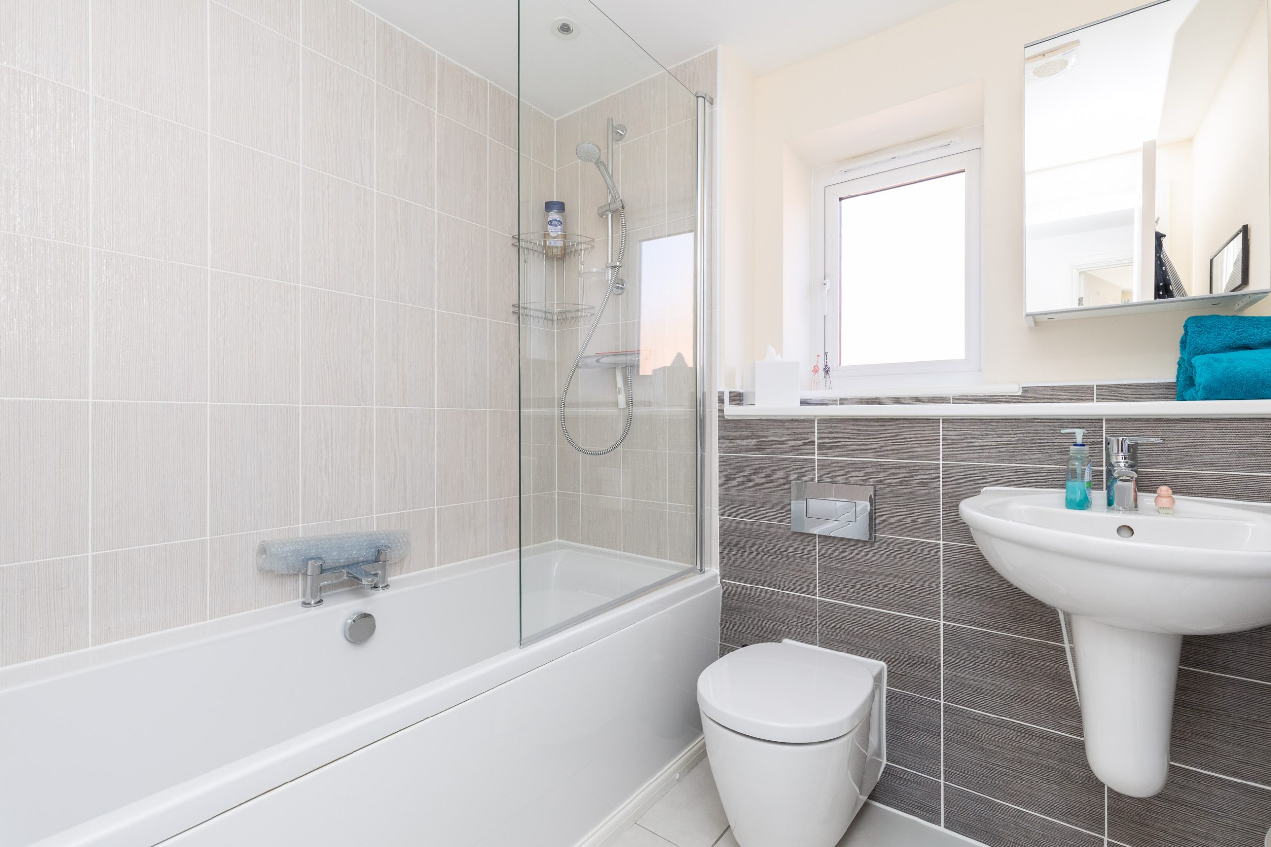 Dimensions: 2.08m x 1.88m (6'10" x 6'2"). White suite comprising panel bath with shower over, low flush W/C and hand basin, inset ceiling lighting, tiled floor, half tiled walls, radiator.
