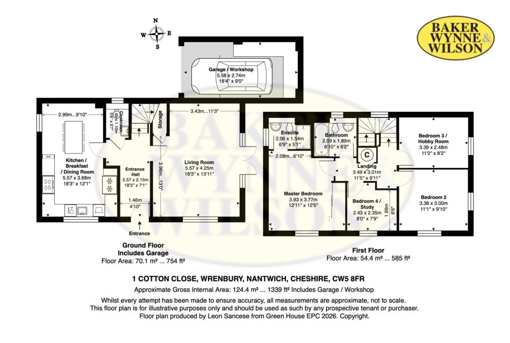 Reception Hall, Cloakroom, Living Room, Kitchen/Breakfast Room, Landing, Master Bedroom with Ensuite Shower Room, Three Further Bedrooms, Bathroom, uPVC Double Glazed Windows, Air Source Central Heating, Attached Garage, Car Parking Space, A Lovely, Part Walled Garden enjoying an aspect towards Wrenbury Church. No Upward Chain.