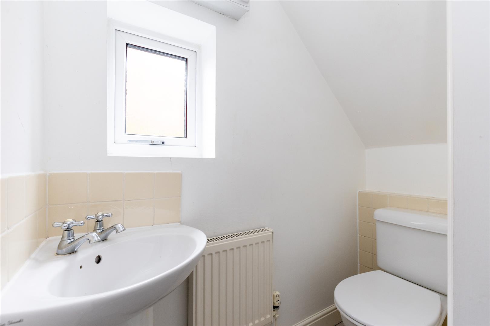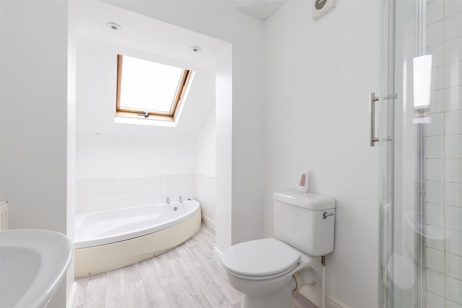 Dimensions: 3.68m x 1.75m (12'1" x 5'9" ). White suite comprising hand basin, low flush WC and sunken corner bath, tiled shower cubicle, with shower, shaver point, double glazed roof light, radiator.