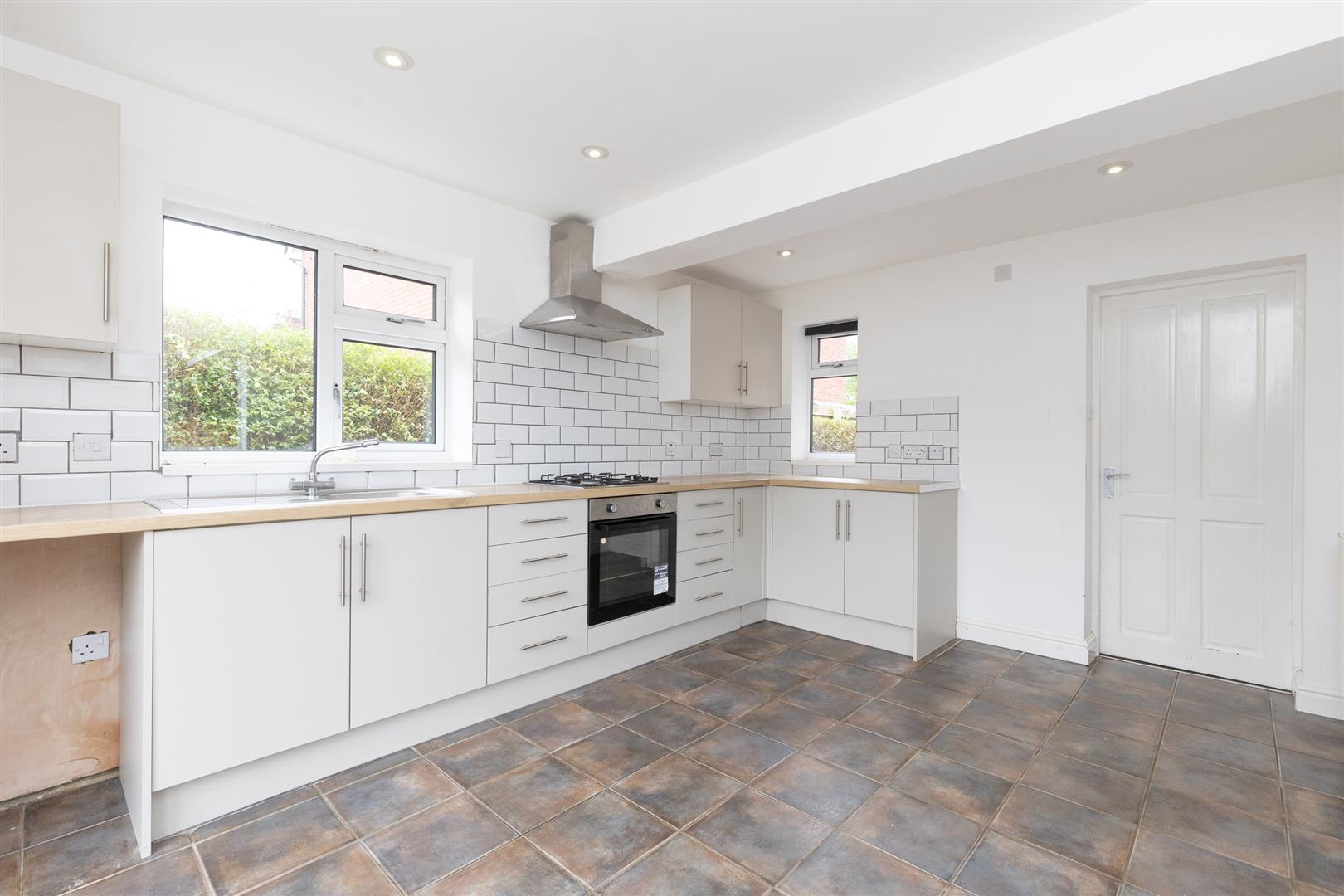 Dimensions: 4.17m x 3.25m (13'8" x 10'8" ). Re fitted in 2023, stainless steel single drainer sink unit, cupboards under, floor standing cupboard and drawer units with work tops, wall cupboard, integrated oven and four burner gas hob unit with extractor hood above, tiled floor, two double glazed windows and French windows to rear, radiator.