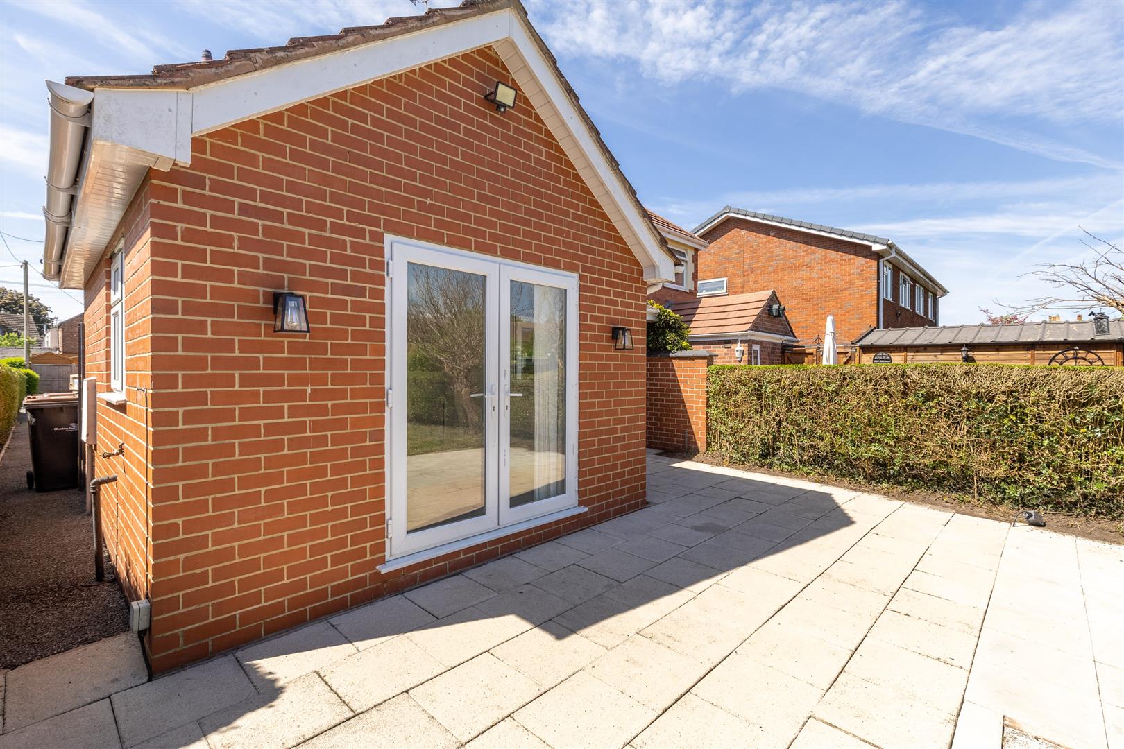 Large flagged patio, outside tap, exterior lighting, Garden shed.