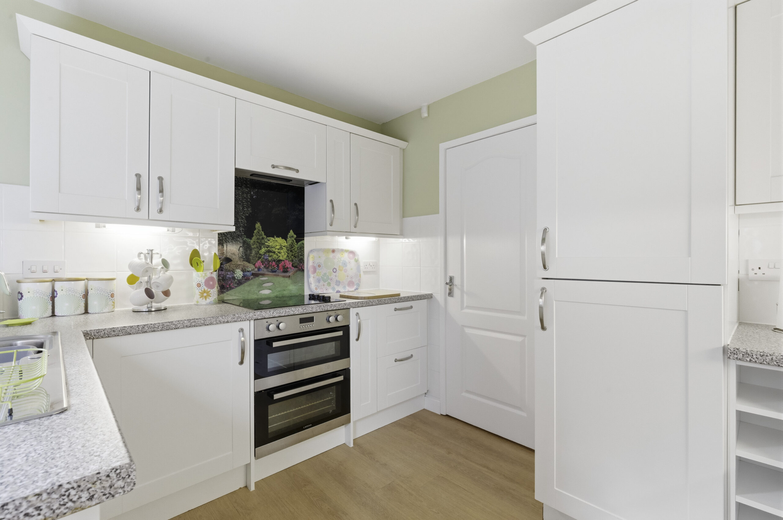 Stainless steel one and half bowl sink unit, fitted floor standing cupboard and drawer units, broom cupboard with glow worm gas fired combination boiler, integrated oven, hob with extractor hood above, integrated dishwasher, washing machine and refrigerator/freezer.