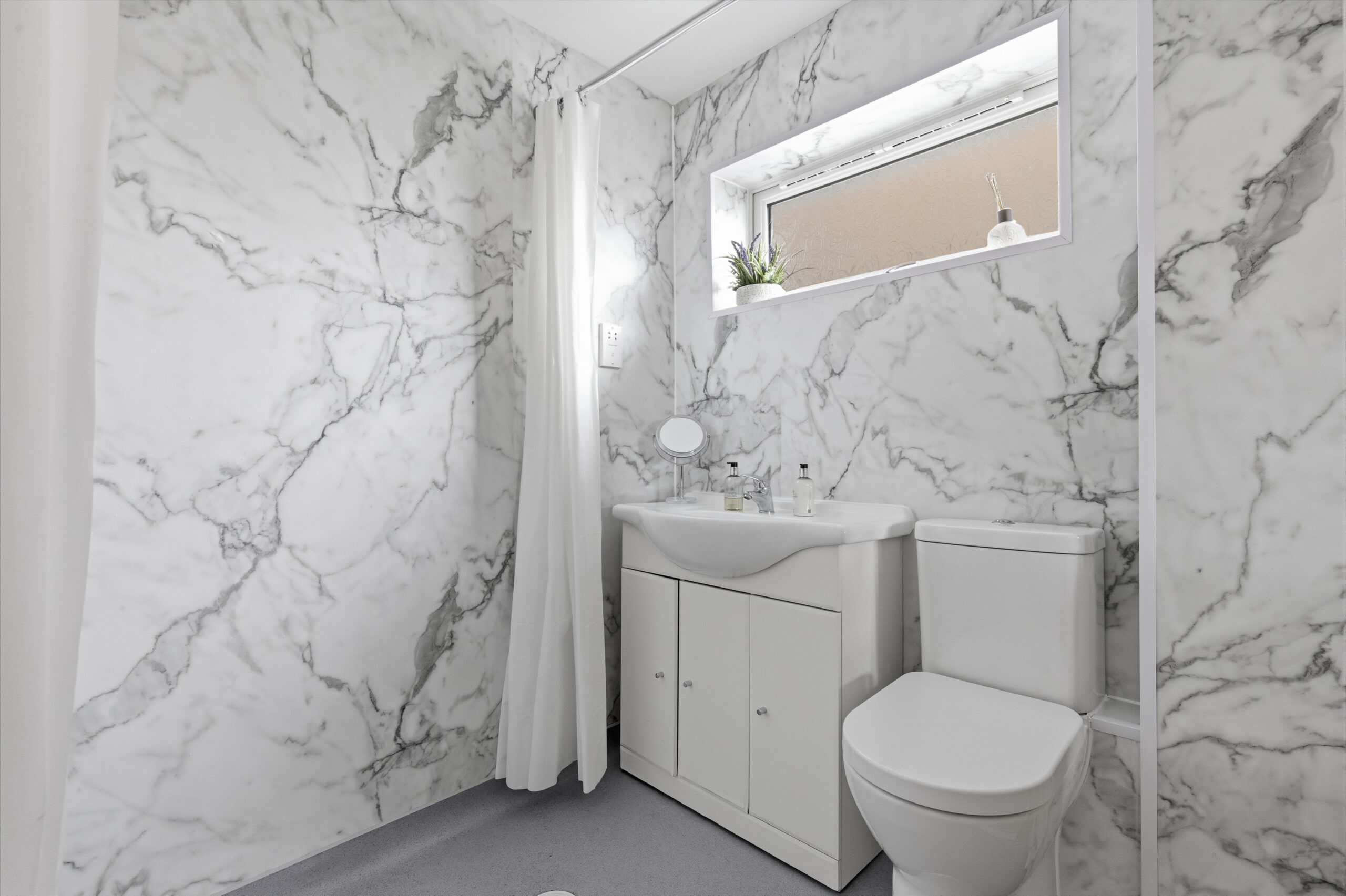 Built in double wardrobes with sliding doors, double glazed window with shutters, wet room with shower, low flush W/C and vanity unit with inset hand basin.