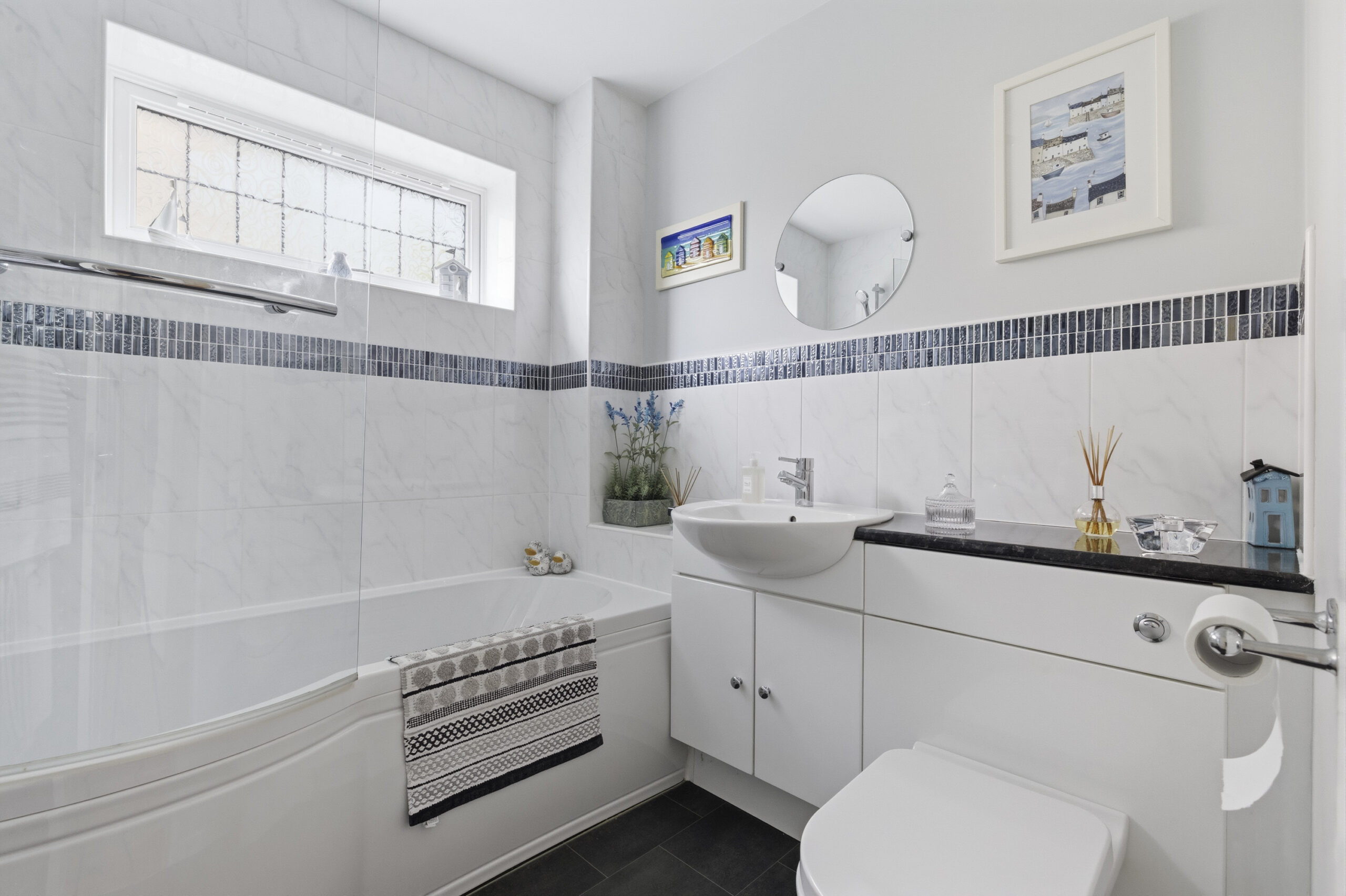 Fully tiled around bath, white suite comprising panel bath with shower over, vanity unit with inset hand basin and low flush W/C.