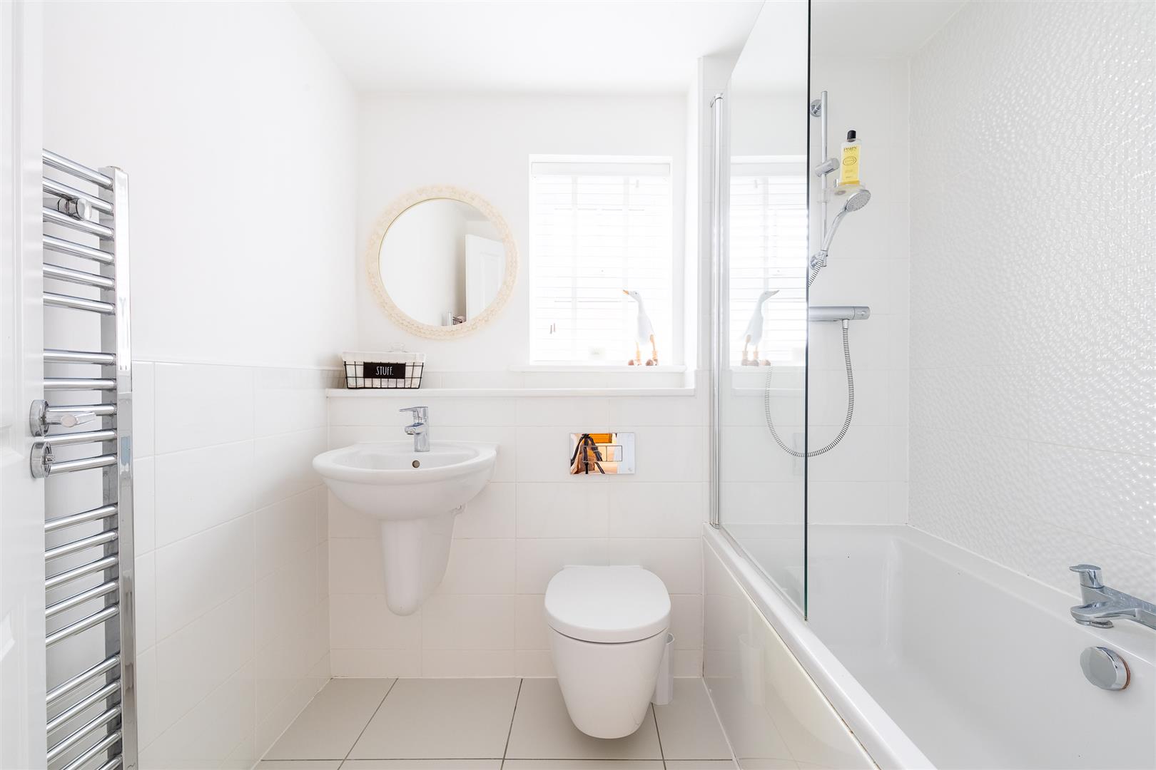 Dimensions: 2.08m x 1.93m (6'10" x 6'4"). A three piece suite comprising of a panelled bath with a glass shower screen, fully tiled shower area and overhead shower, low flush WC and a wall mounted sink. The rest of the room is completed with a tiled floor, half-tiled walls, heated towel rail, double-glazed frosted window to the side and a extractor fan.