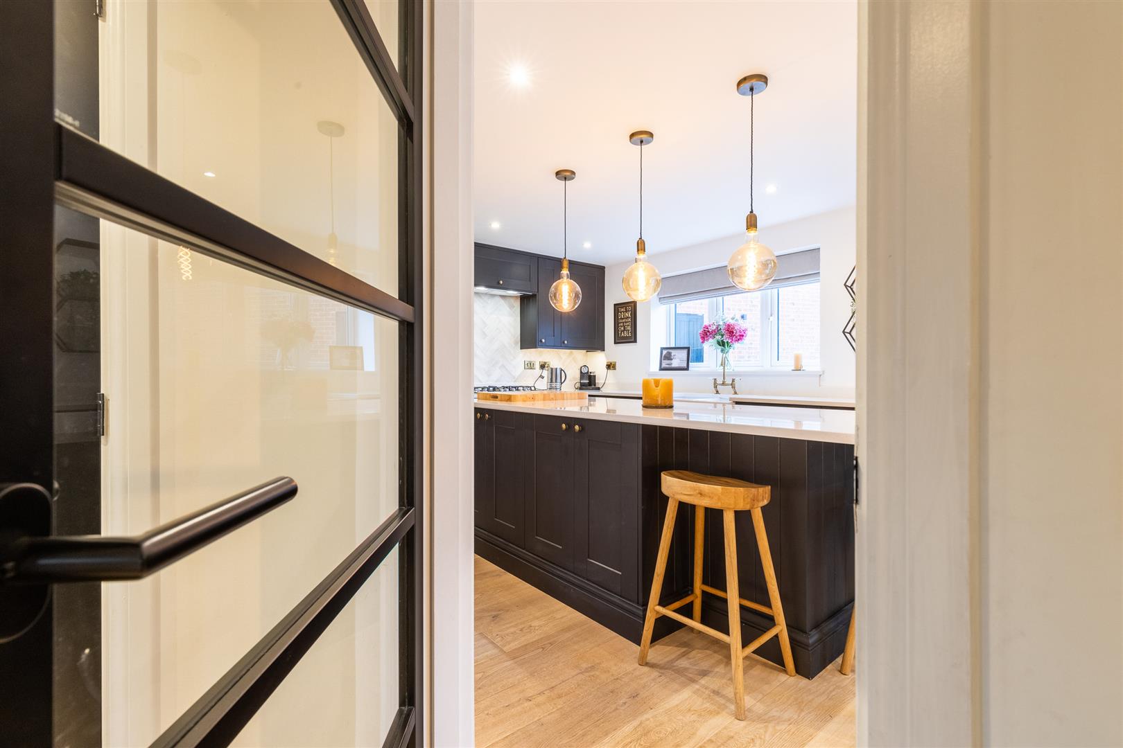 Oak flooring, a range of above and below counter storage cupboards, white quartz worktops, tiled splashback. Integrated appliances include a Neff fridge, Hotpoint oven, Hotpoint five-ring gas hob, extractor fan, integrated under-counter fridge, drinks cupboard, integrated dishwasher, and integrated bin storage. Double Belfast sink. Central island with breakfast bar, quartz worktop, and under-counter cupboards. Spotlights and three pendant lights. One radiator.