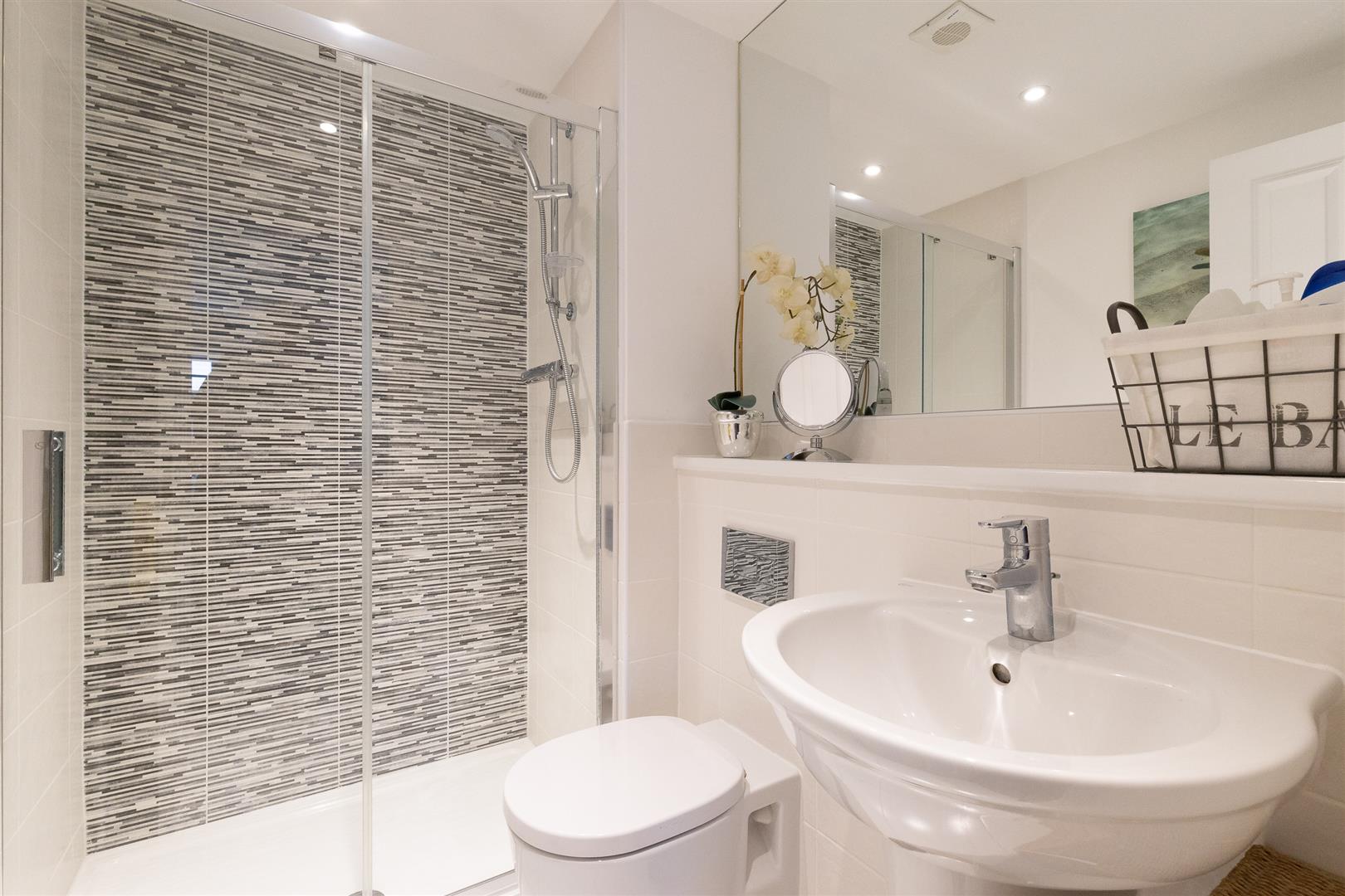 Dimensions: 2.08m x 1.55m (6'10" x 5'1"). A three piece suite comprising of a low flush WC, wall mounted sink, glass shower cubicle with fully tiled walls. The room is finished with a heated towel rail, tiled floor, half-tiled walls, extractor fan and spotlights.