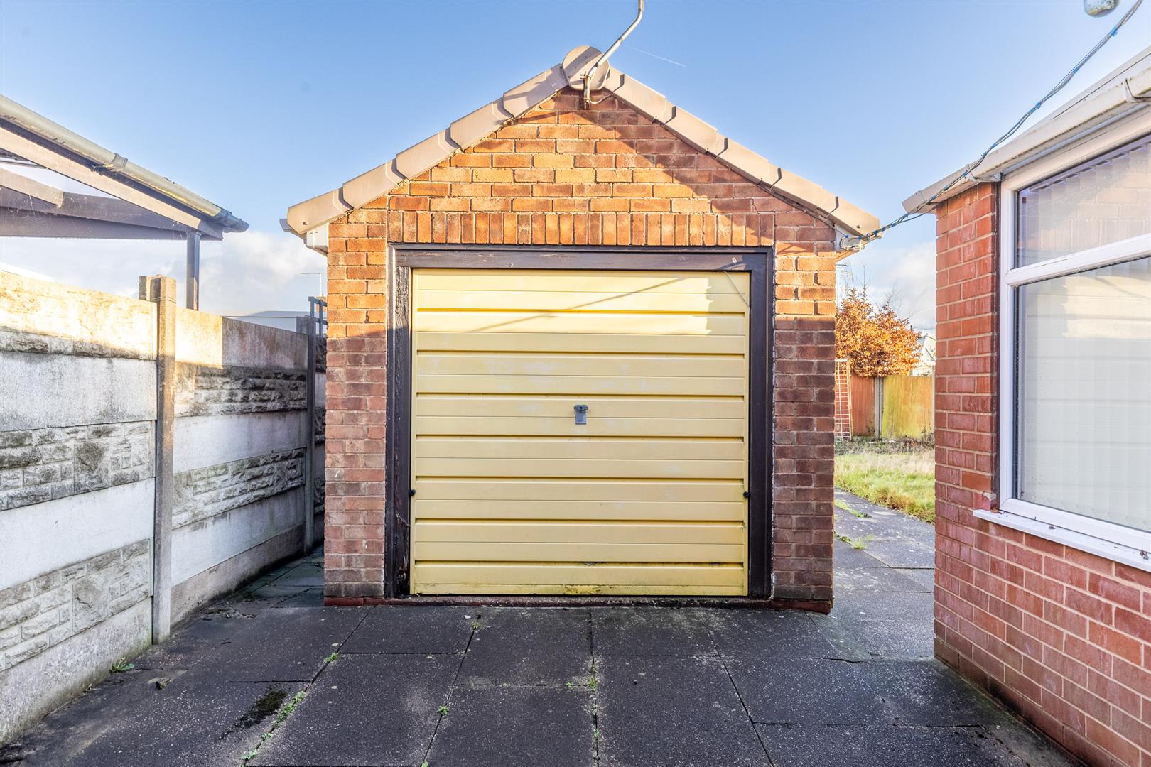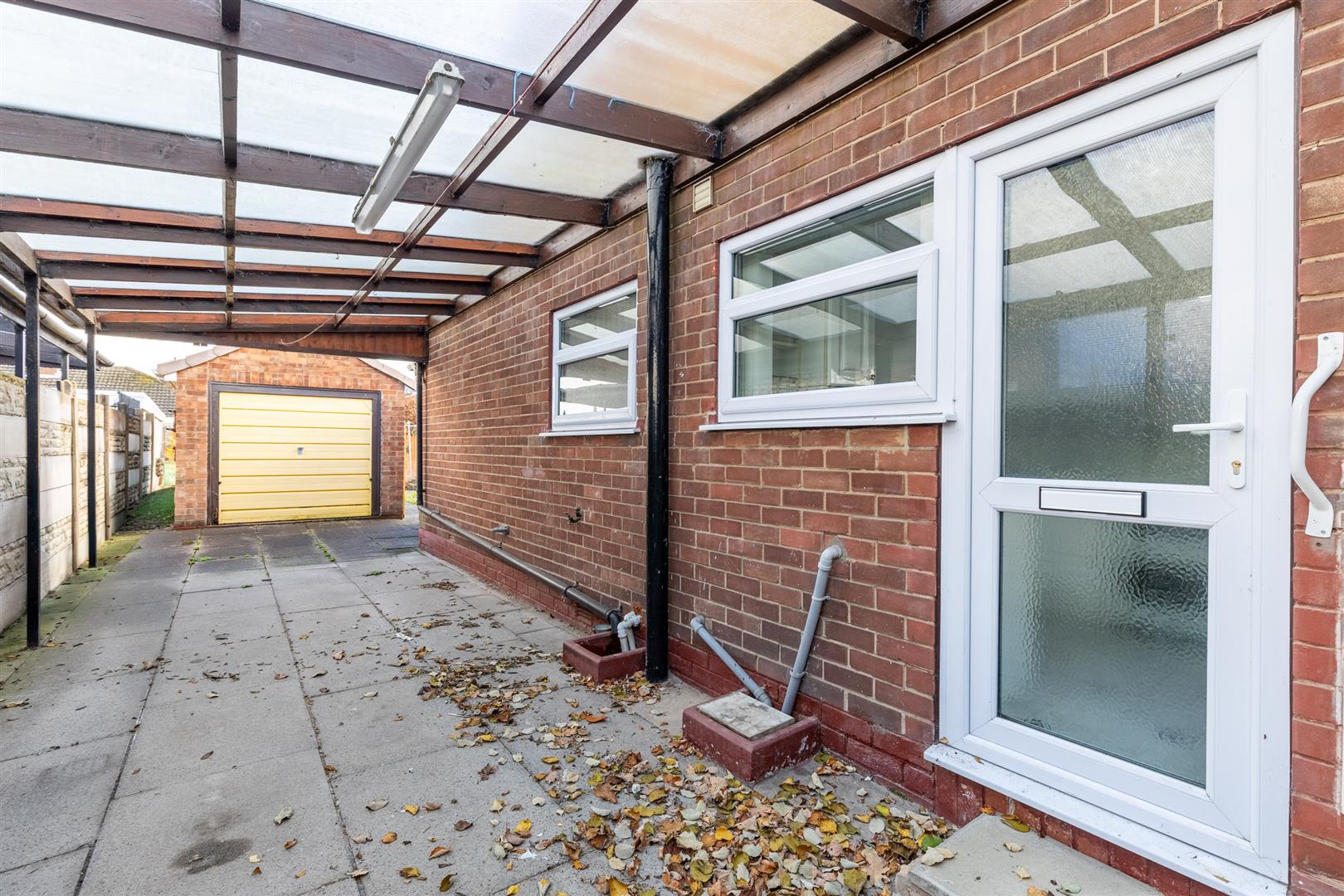 Paved frontage driveway extending to side with useful timber covered car port, detached brick and tile single garage (15’11” x 8’10”), power and light, rear patio and lawned garden, paved hardstanding