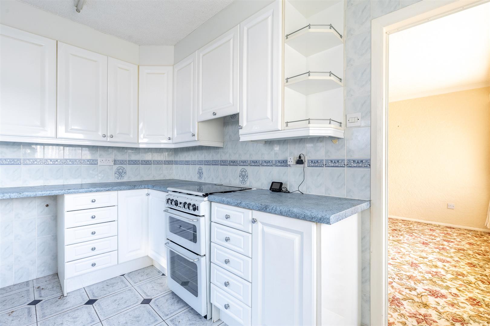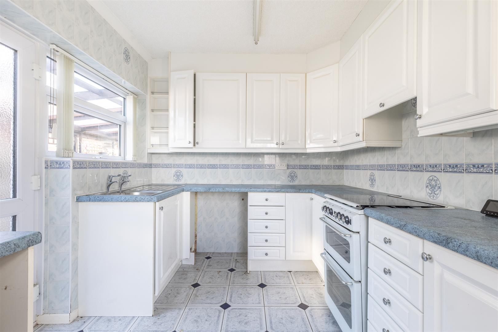 Dimensions: 3.43m x 2.54m (11'3" x 8'4"). Modern fitted units to four elevations, providing base and wall units, stainless steel sink unit, space for gas cooker, uPVC double window and door, radiator.