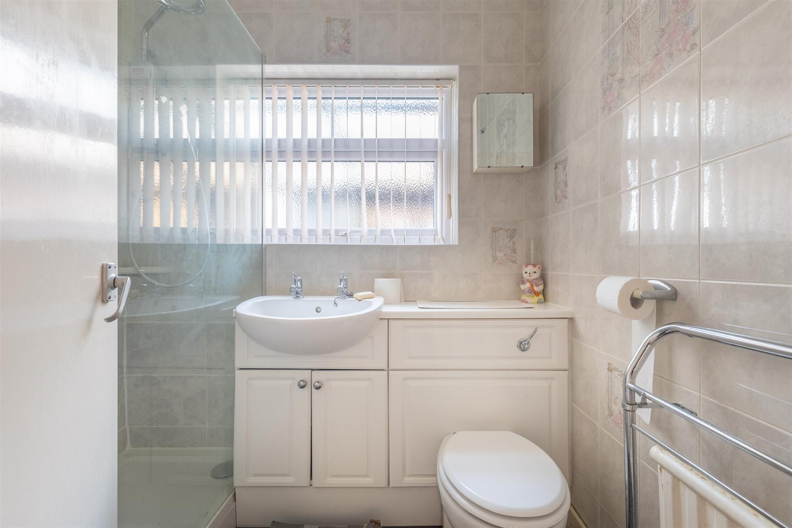 Dimensions: 2.01m x 1.68m (6'7" x 5'6"). Cubicle with electric shower, vanity wash hand basin with enclosed cistern WC, radiator