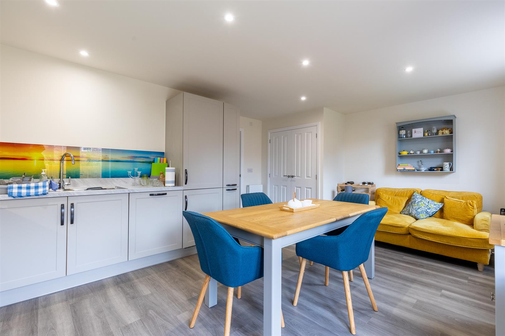 Dimensions: 5.56m x 4.27m (18'3" x 14'0"). Pebble grey floor standing cupboards with matching wall mounted cupboards and under cupboard lighting, grey worksurfaces, a range of fitted appliances including a dishwasher, fridge, freezer, five ring gas hob burner, double oven and extractor fan. Additionally, there is a larder, single bowl sink, TV point, spotlights, radiators, Nordic Oak Antico flooring, window to the rear, patio doors to the garden and access to the utility cupboard.