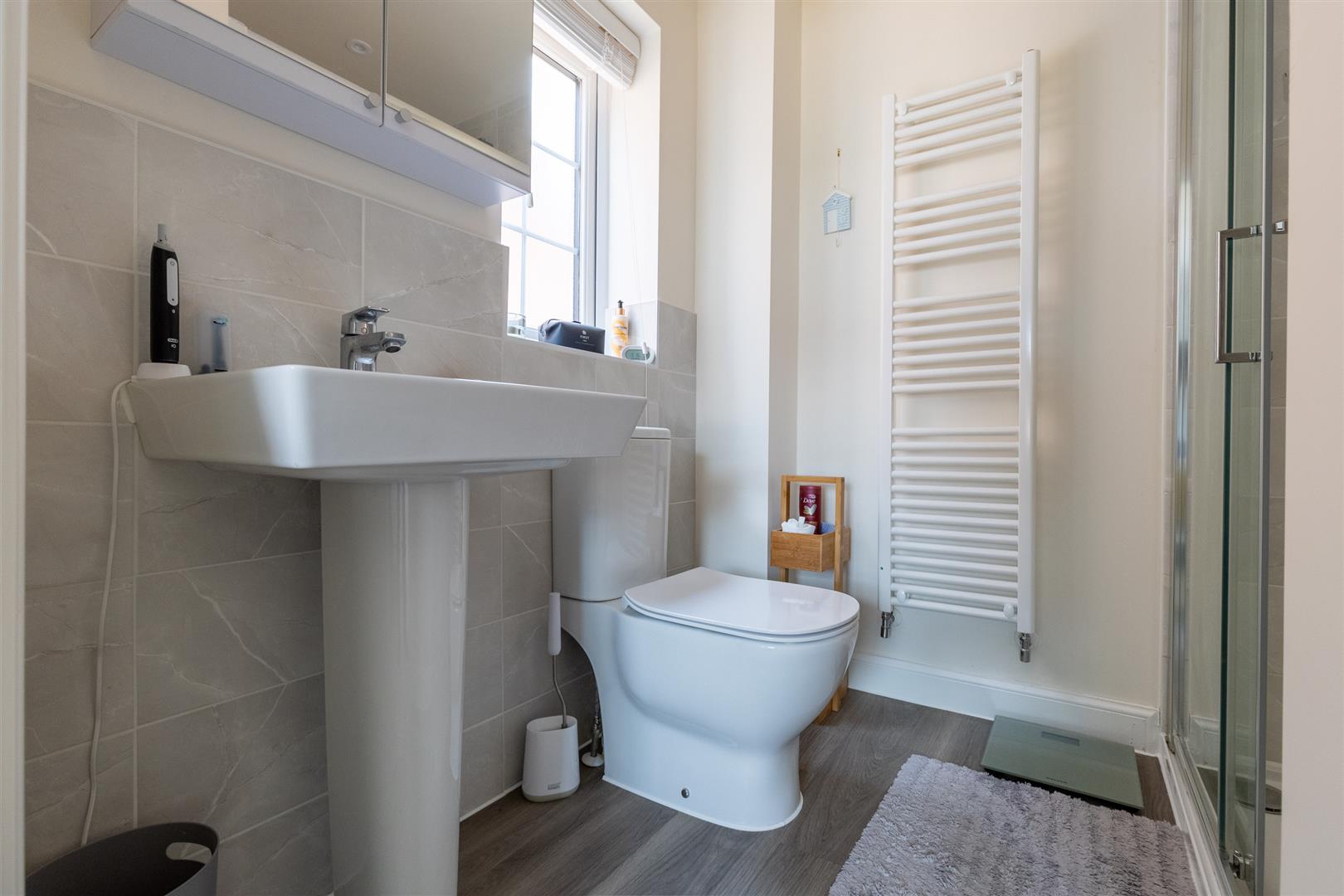 Dimensions: 1.93m x 1.73m (6'4" x 5'8"). Three piece white suite comprising of a walk in tiled shower cubical, low flush W/C, pedestal sink with mirrored cupboard above, heated towel rail, spot lights, Nordic Oak Antico flooring, frosted window to the side.
