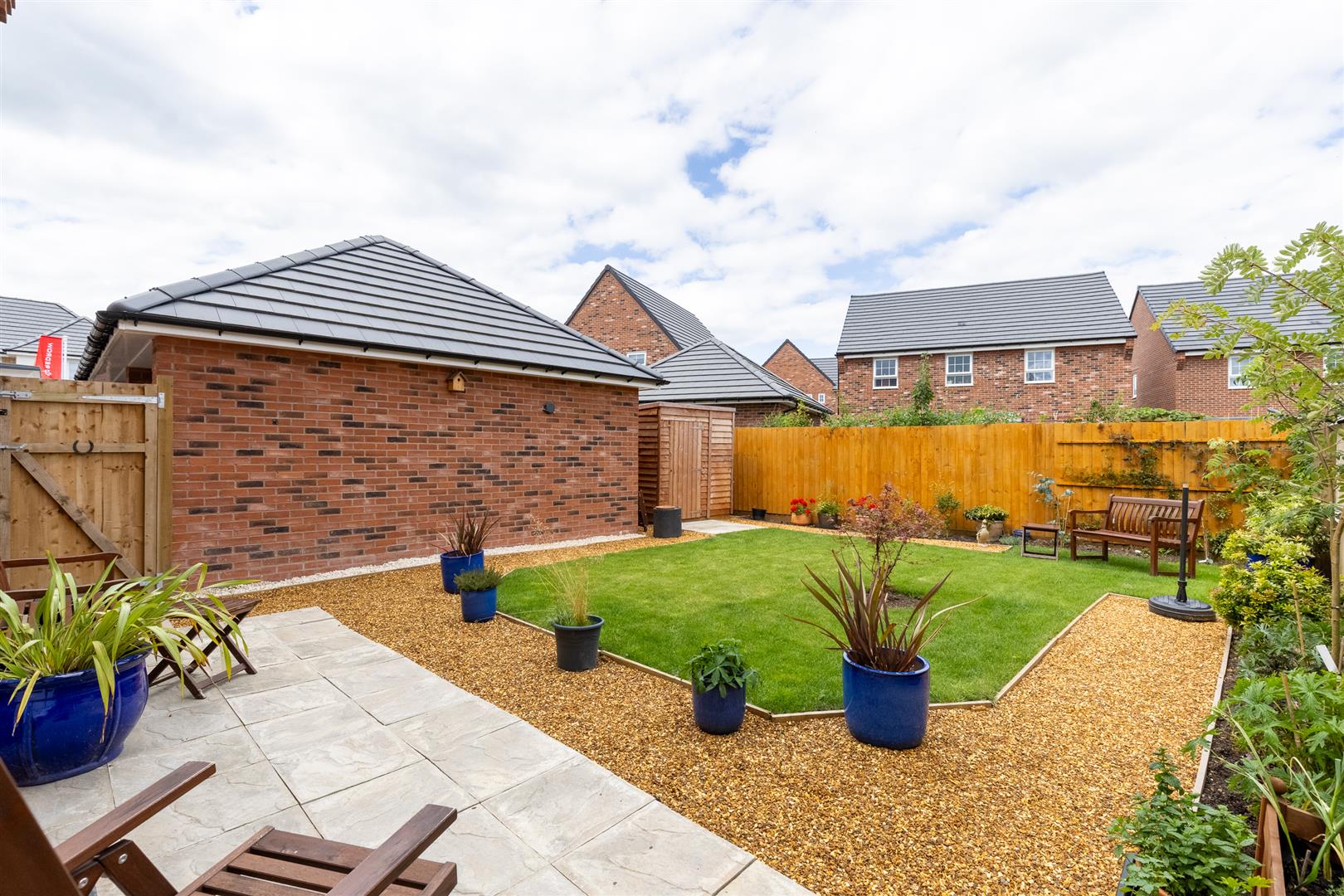 A beautifully landscaped garden comprising of a lawned area with gravel paths around the edge, a flagged patio, well maintained flower beds on two sides, access down either side of the property and a shed.