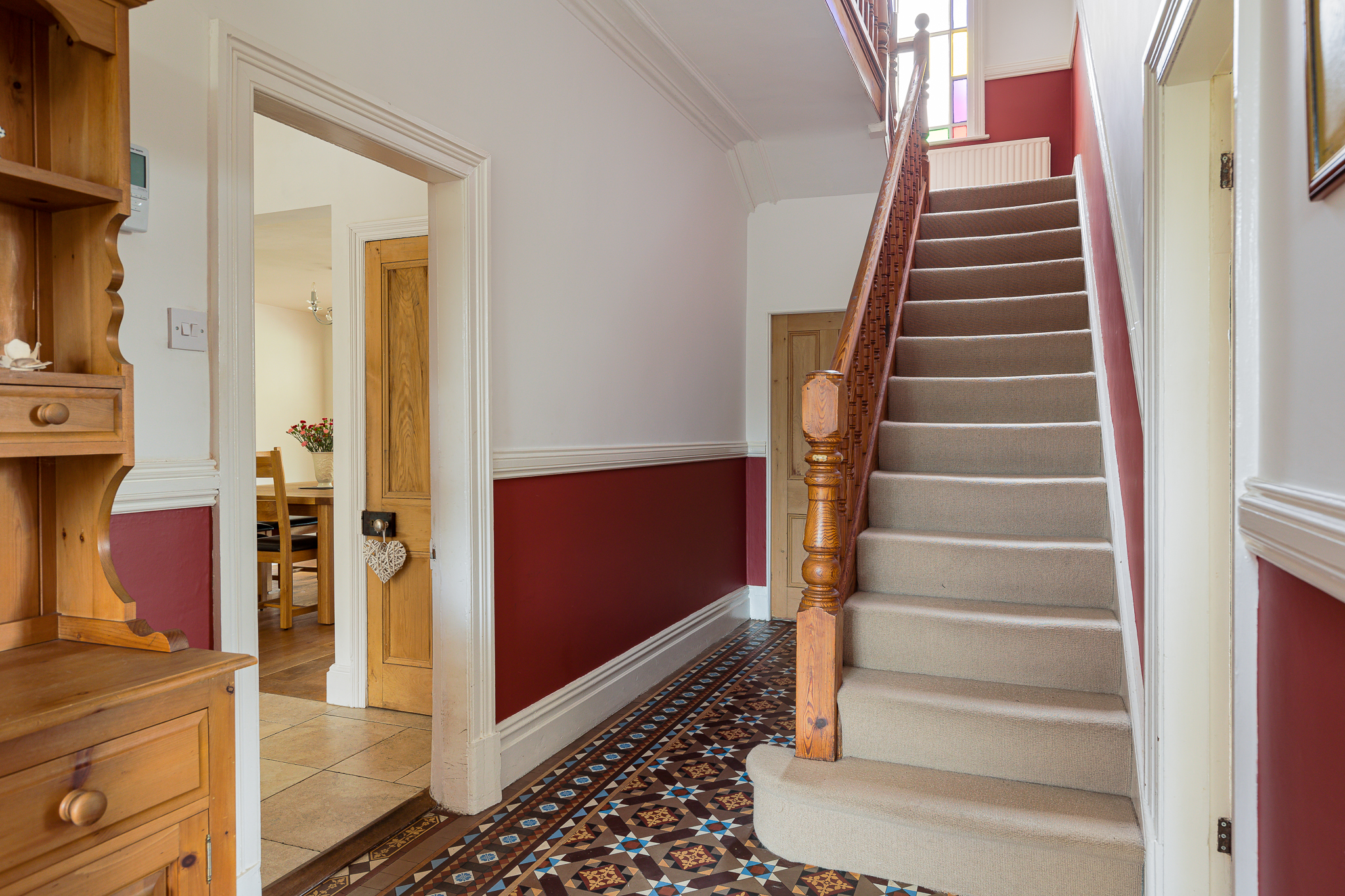 Minton tile floor, Dado rail, under stairs cloak store, entrance door with stained glass inset.
