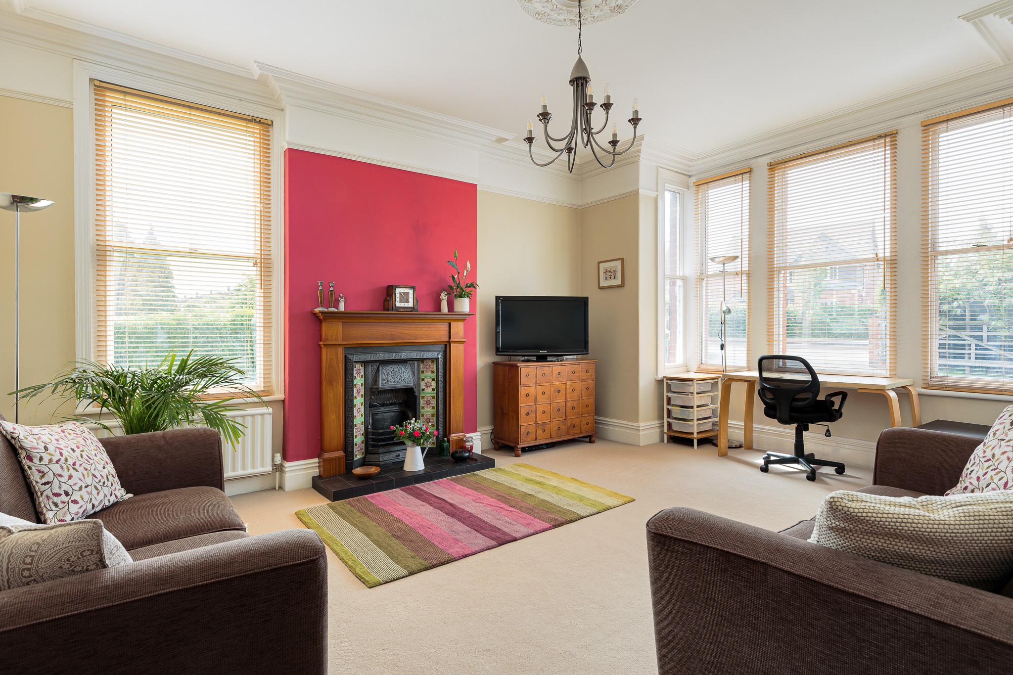 Open fire place with timber surround, tiled and cast inset and tiled hearth, double glazed sash box bay window to front and double glazed sash window to side, picture rail, two picture lights, ceiling cornices and rose, two radiators.