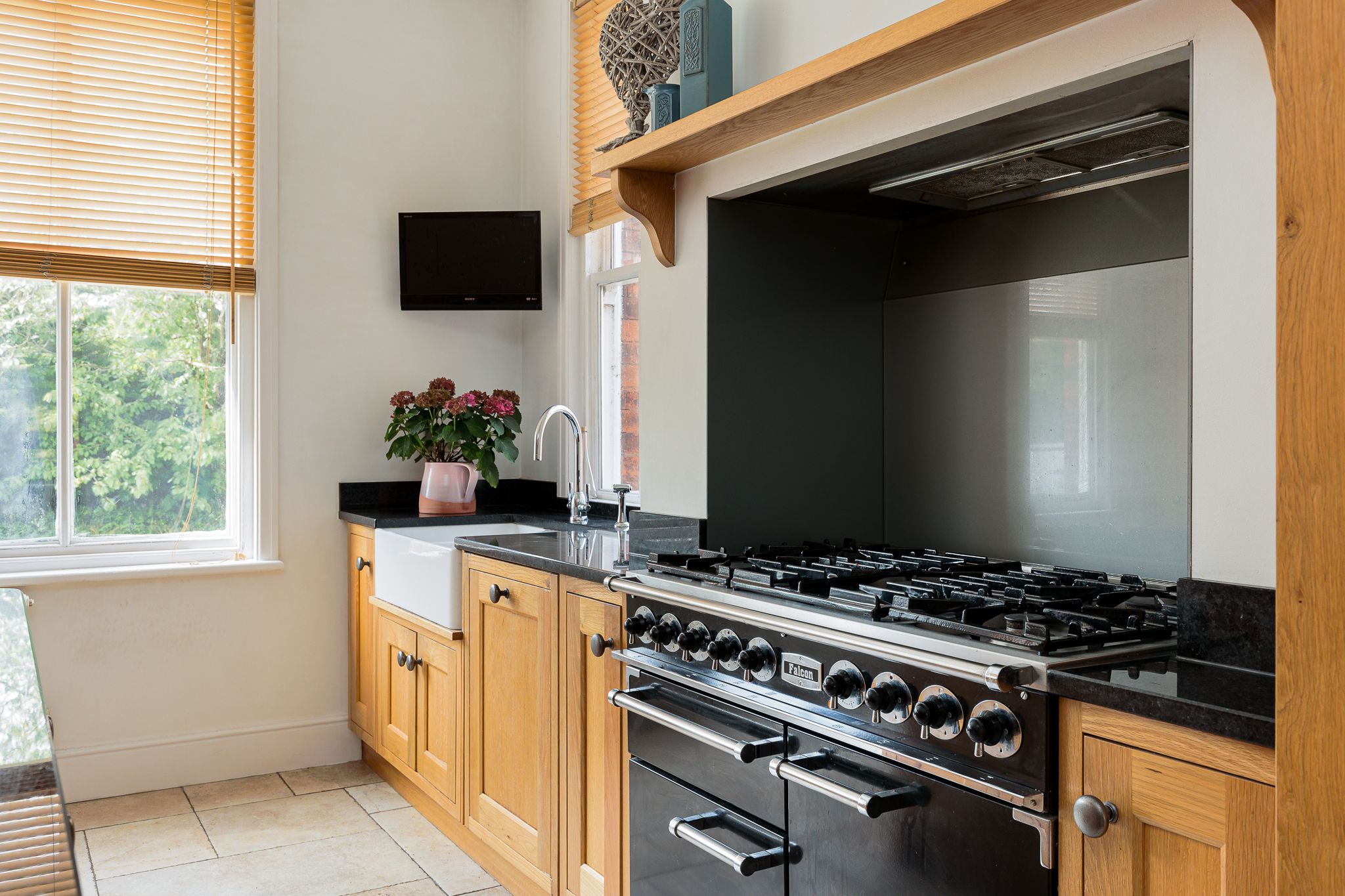 Excellent range of light oak furniture comprising floor standing cupboard and drawer units with granite worktops, wall cupboard, house keepers/larder cupboard, double Belfast sink in granite surround, island unit/breakfast bar, inset for range style cooker and American style fridge freezer, BOSCH integrated microwave, three double glazed sash windows, inset ceiling lighting, tiled floor with under floor heating, pantry cupboard.