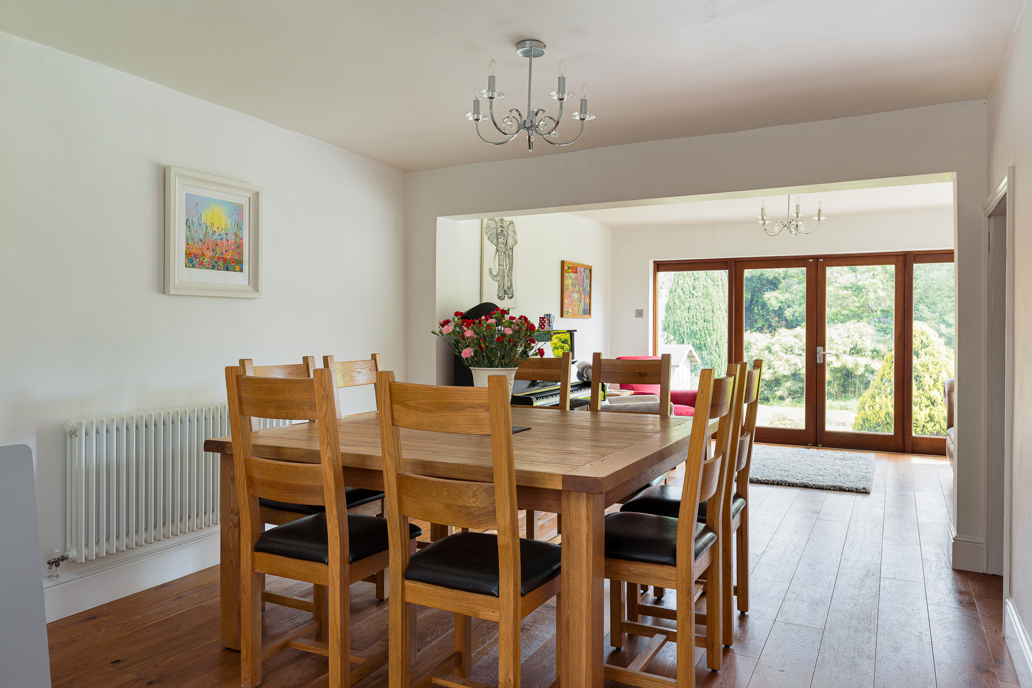Engineered oak floor, three double glazed windows, double glazed French windows.