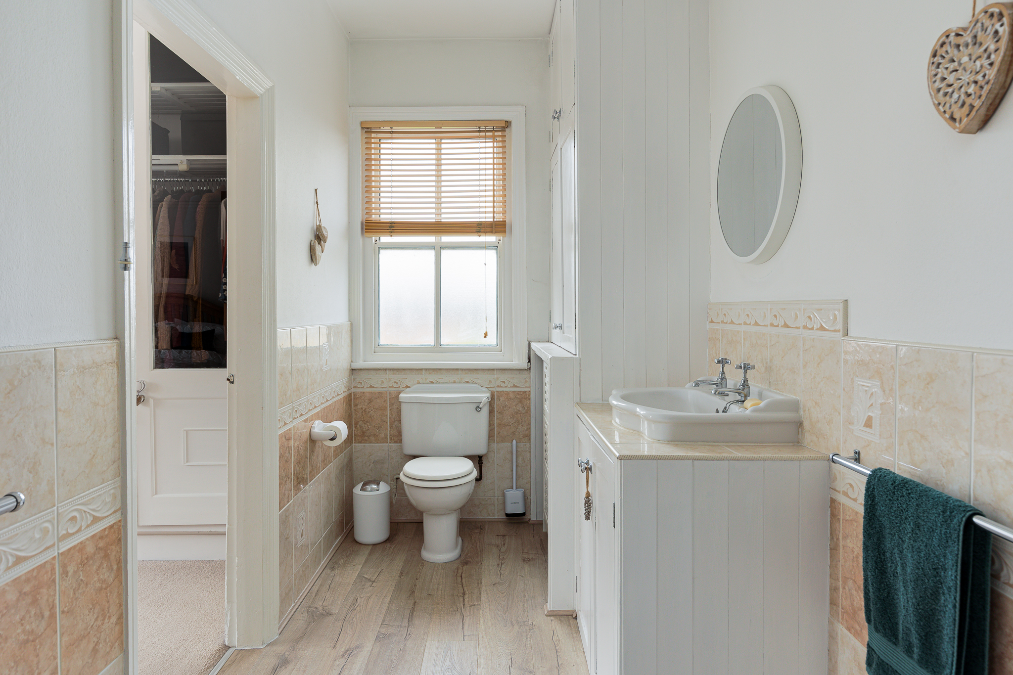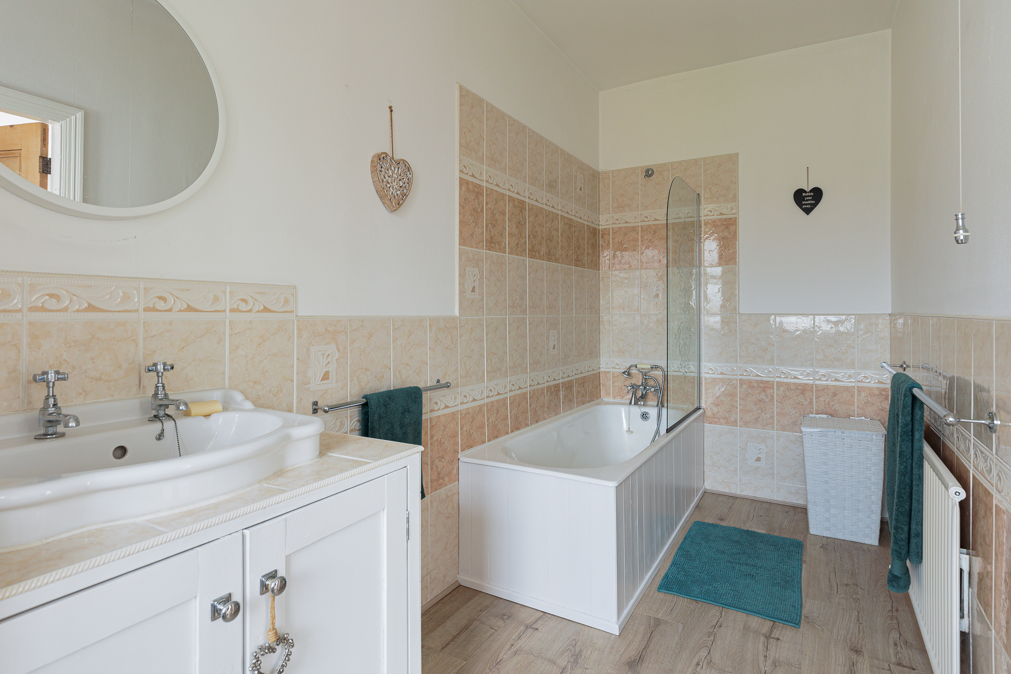 Suite comprising cast iron bath with mixer shower, vanity unit with inset hand basin, low flush WC, wood laminate floor, linen cupboard, half tiled walls, double glazed sash window, radiator.