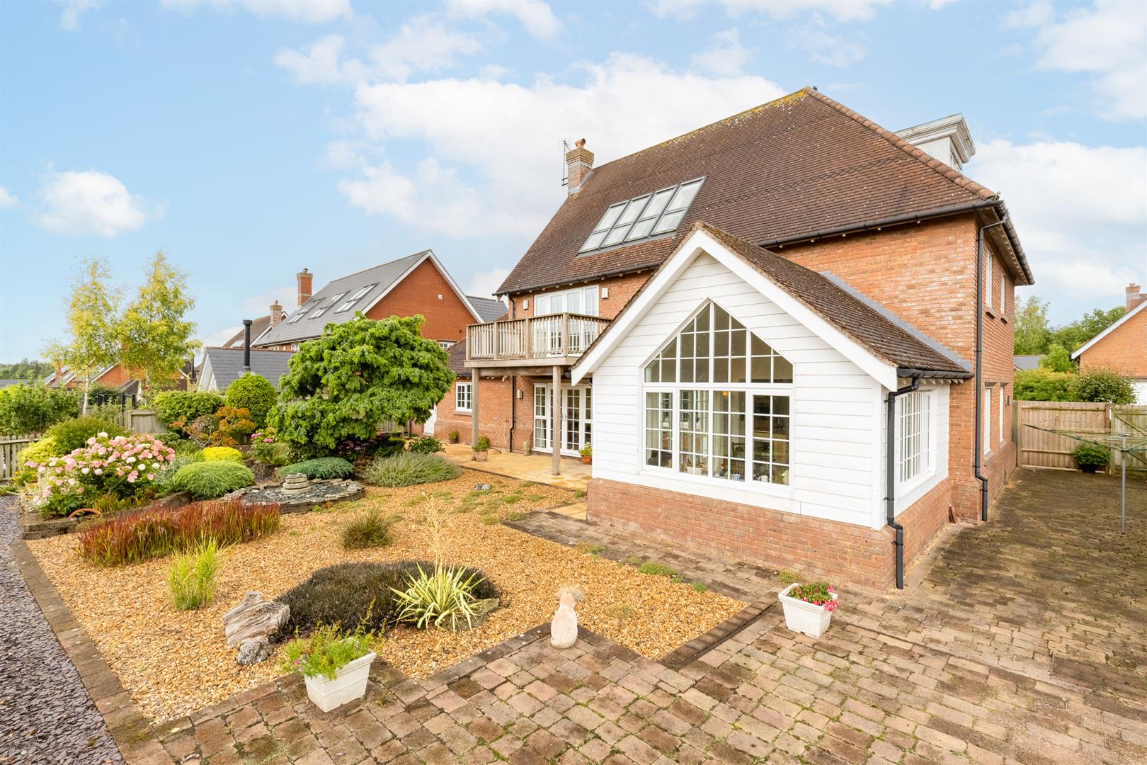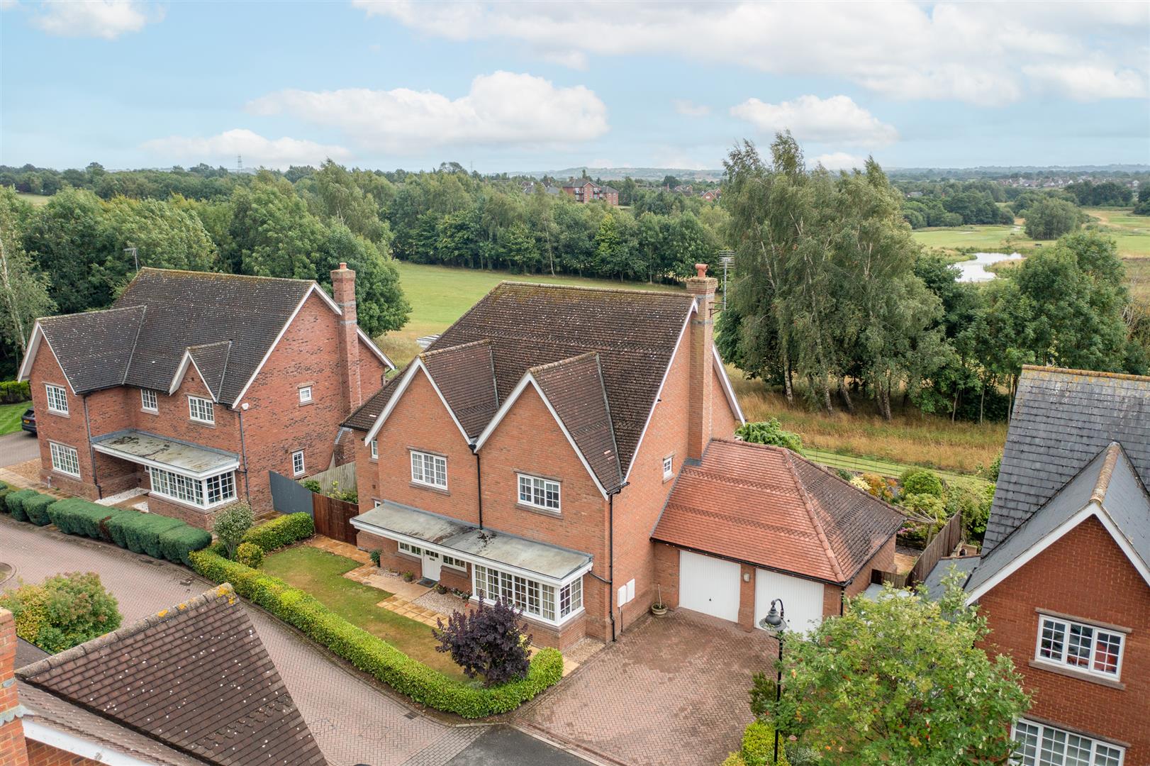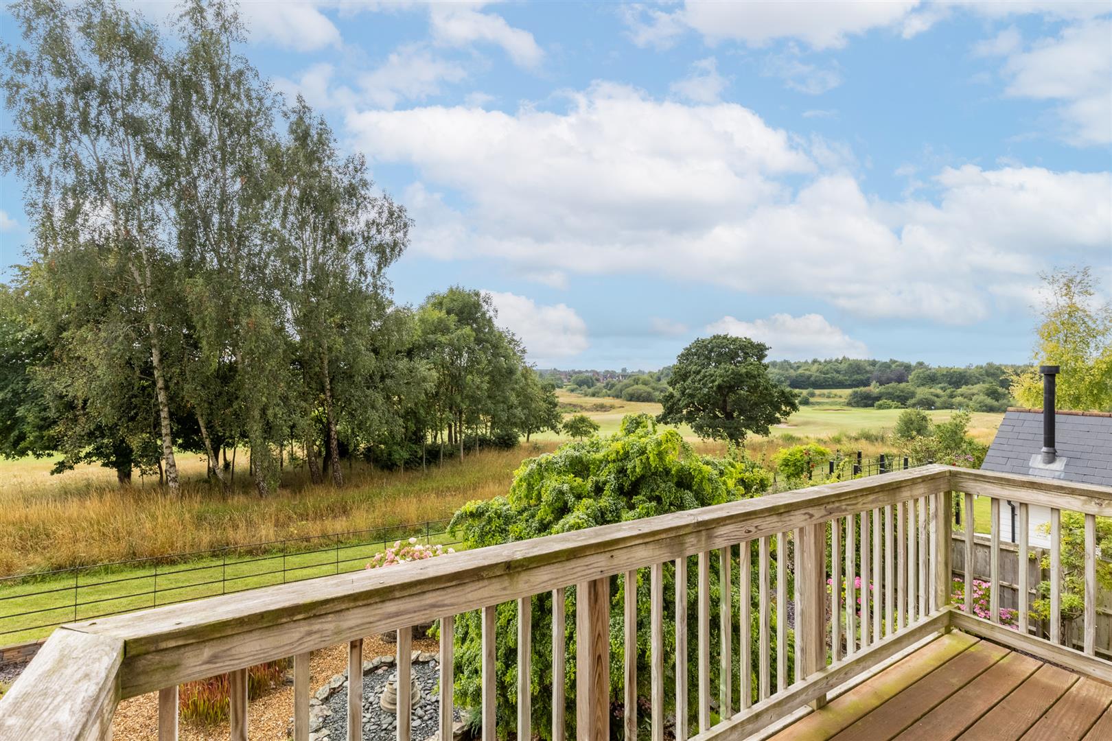 The south-facing rear garden with an irrigation system includes two patio areas, a gravelled section, and established planting with shrubs, flowers, and mature planters. The garden is enclosed by a combination of wooden fencing and wrought iron fencing, and enjoys views over the first hole of Wychwood Park’s golf course. Gated side access is available.