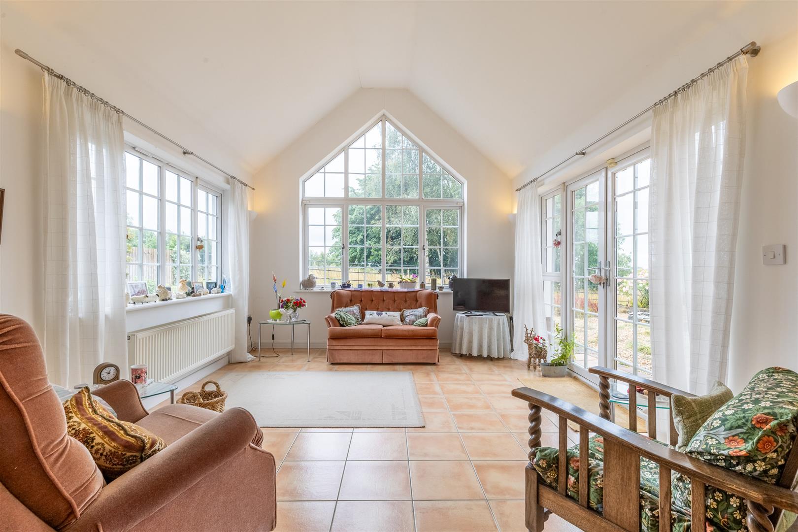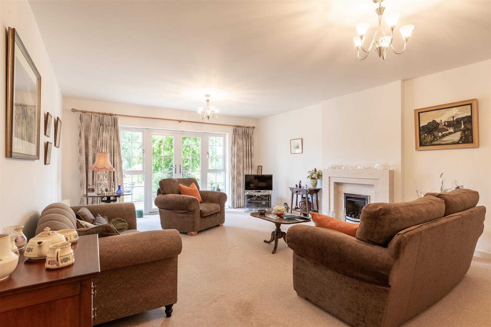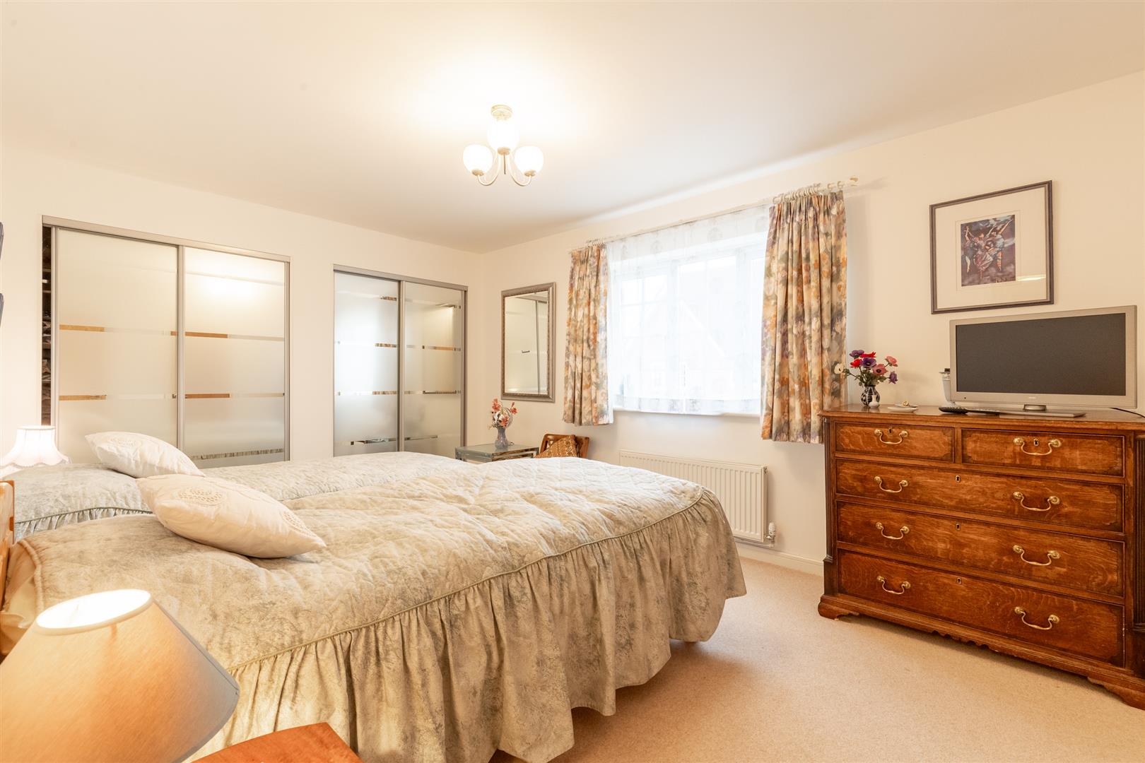 The south-facing rear garden with an irrigation system includes two patio areas, a gravelled section, and established planting with shrubs, flowers, and mature planters. The garden is enclosed by a combination of wooden fencing and wrought iron fencing, and enjoys views over the first hole of Wychwood Park’s golf course. Gated side access is available.
