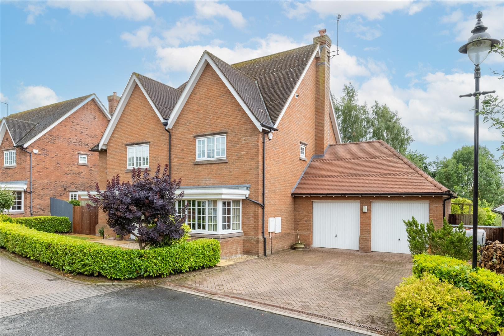To the front is driveway parking for two vehicles in addition to the double garage. The garage includes two electric up-and-over doors, lighting, rear aspect double glazed windows, and a rear access door to the garden. The front garden includes a lawned area bordered by hedging, with a paved path leading to the entrance and around the side of the property.