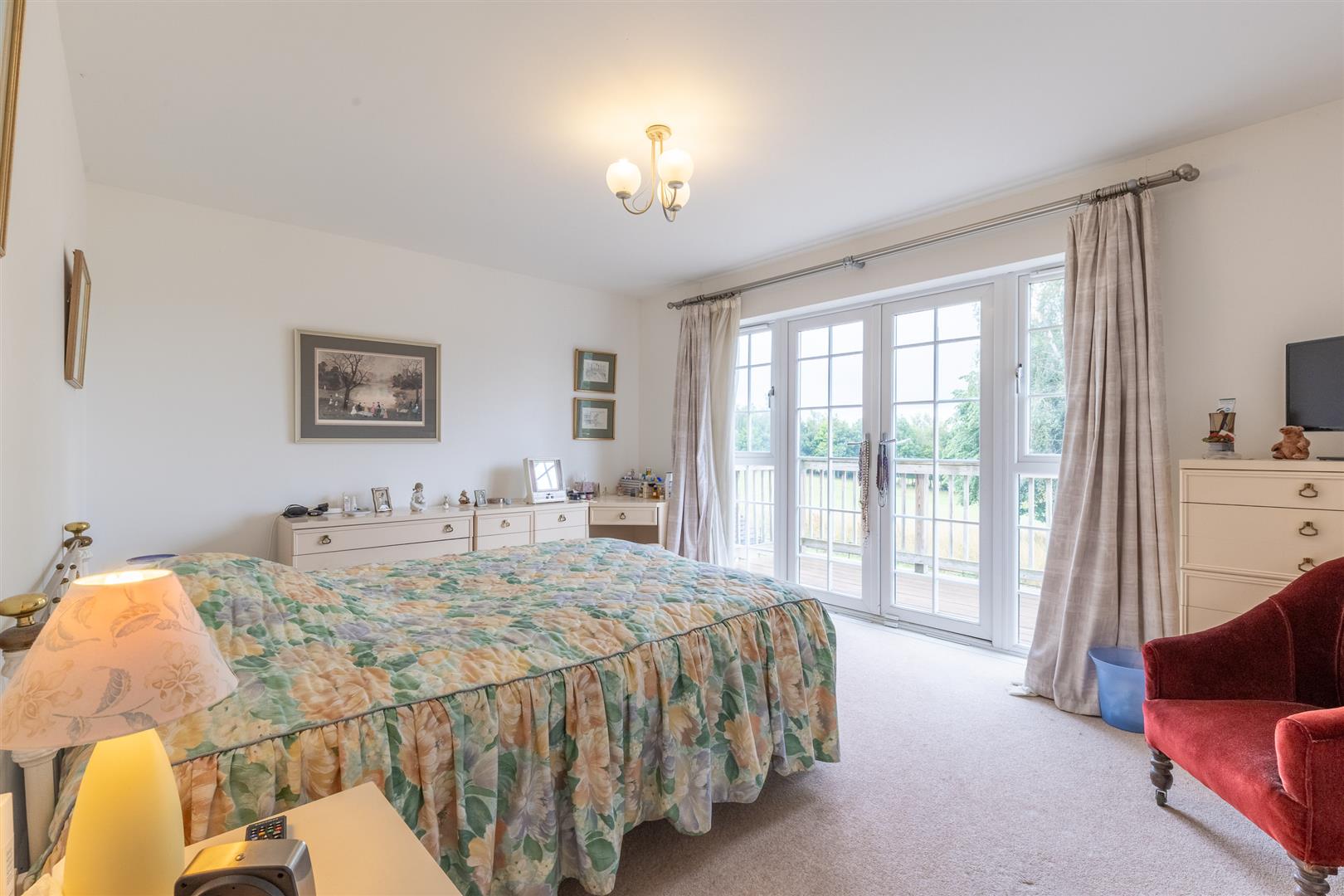 The first-floor landing is carpeted and includes a radiator, access to the airing cupboard, and storage space. The master bedroom has carpeted flooring, a radiator, pendant light, and double glazed French doors opening onto a balcony with views over the golf course. A walk-in wardrobe features carpeted flooring, four sliding built-in wardrobes, spot lighting, and a radiator. The en-suite comprises a walk-in shower with fully tiled walls and glass screen, panelled bath, low flush W/C, sink, radiator, frosted double glazed window to the front, carpeted flooring, spot lights, and half tiled walls. Bedroom two has two built-in wardrobes, carpeted flooring, radiator, pendant light, and a double glazed window to the front. Its en-suite includes a shower cubicle with fully tiled walls and glass screen, low flush W/C, sink, radiator, carpeted flooring, spot lights, extractor fan, half tiled walls, and a frosted window to the front. Bedroom three includes a side aspect double glazed window, carpeted flooring, radiator, and ceiling light. Bedroom four has a double glazed window to the rear, carpeted flooring, radiator, and ceiling light. The family bathroom features a panelled bath, shower cubicle with fully tiled walls and glass screen, low flush W/C, sink, frosted side aspect window, half tiled walls, carpeted flooring, spot lights, radiator, and extractor fan.