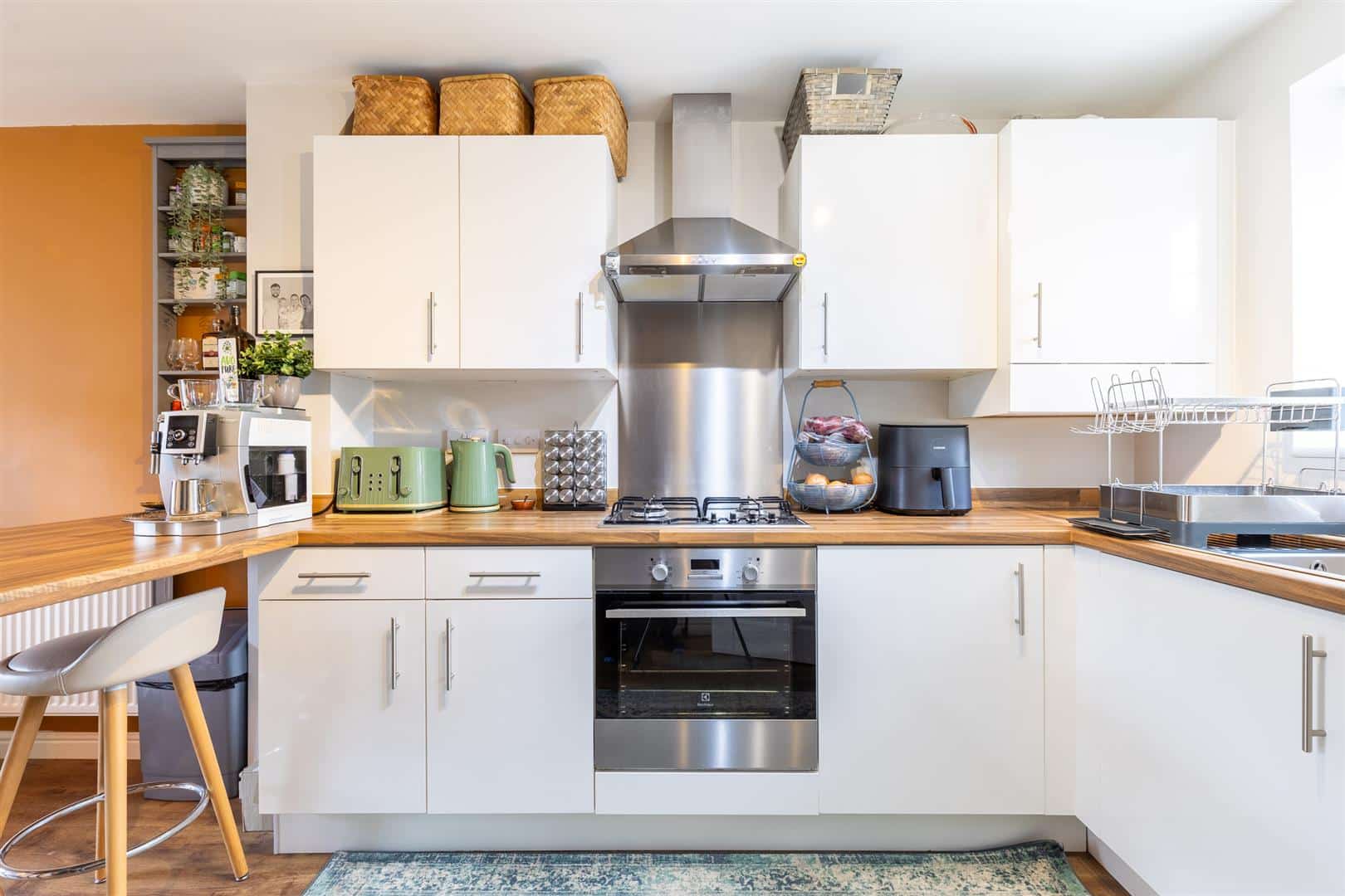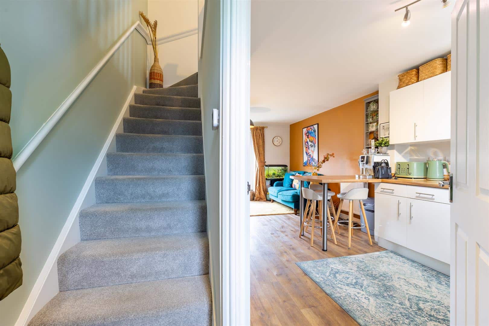 The entrance hall has wood effect laminate flooring, radiator, light fitting, and stairs to the first floor. The kitchen is fitted with matching above and below counter cupboards beneath a wood effect worktop with breakfast bar. Integrated appliances include a four-ring gas hob with extractor fan above, oven, fridge freezer, sink, and washer/dryer. There is a double glazed window to the front of the property, under stair storage, wood effect laminate flooring, and a light fitting. The living area has wood effect laminate flooring, radiator, TV point, light fitting, and double glazed patio doors to the rear garden. Access is provided to the downstairs cloakroom, which includes a low flush W/C, pedestal sink, wood laminate flooring, spotlights, and radiator.
