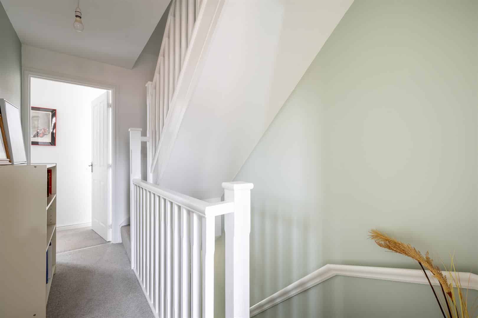 Landing with carpeted flooring, light fitting, and large store cupboard. The master bedroom is a spacious dual aspect room with Velux-style windows and built-in blinds, carpeted flooring, radiator, built-in wardrobe, light fitting, and loft access.