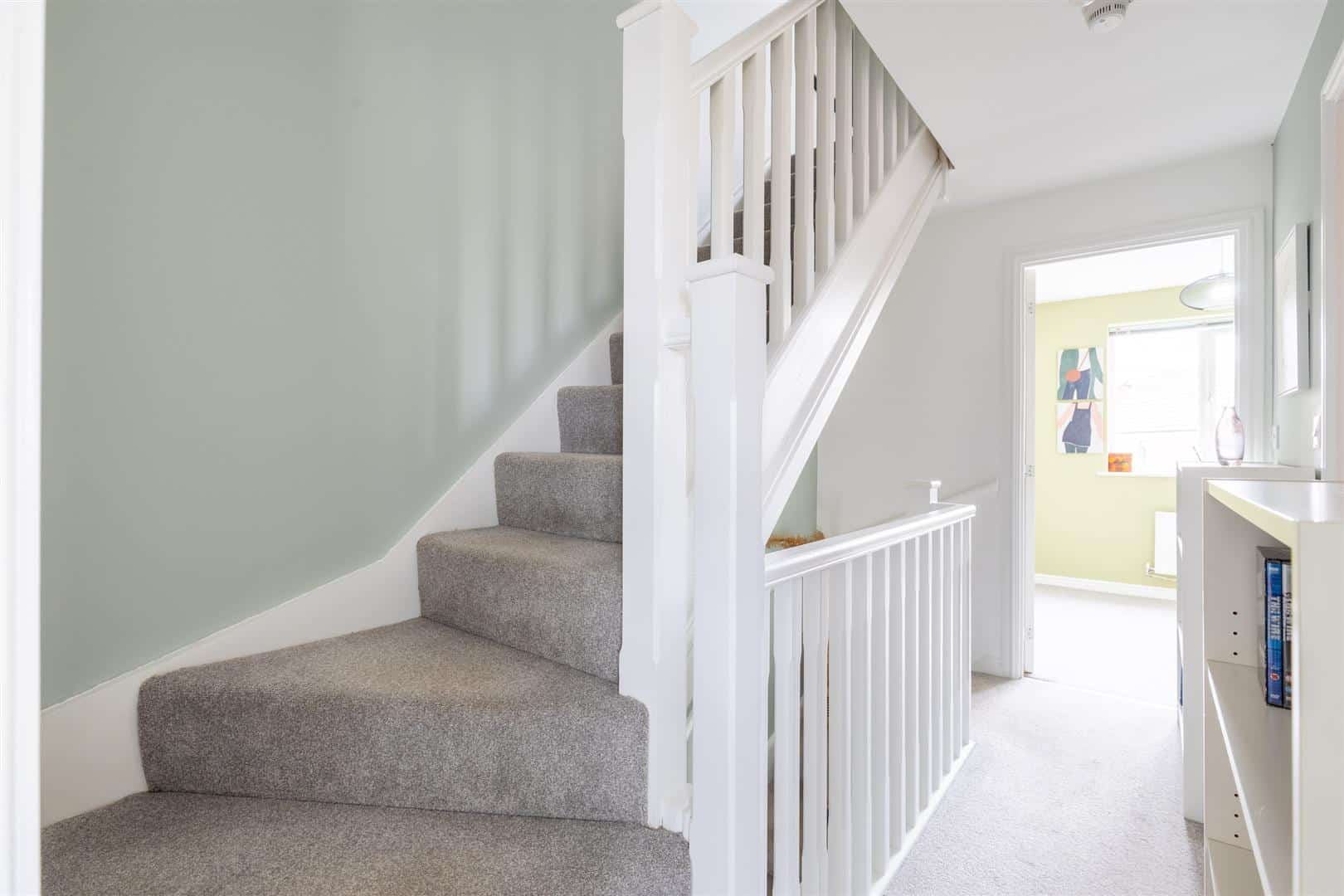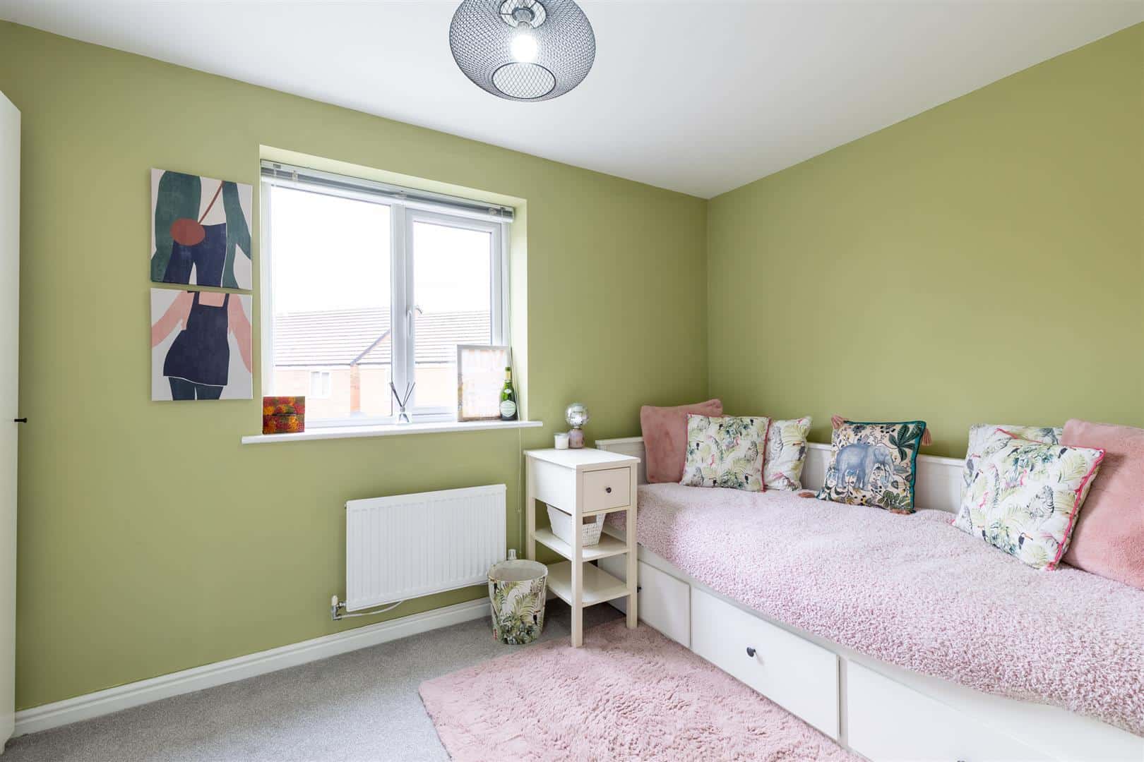 Landing with carpeted flooring, light fitting and radiator. Bedroom two has a carpeted floor, radiator, light fitting, and a double glazed window overlooking the rear garden. Bedroom three has two double glazed windows to the front, carpeted flooring, radiator, and pendant light. The family bathroom includes a three-piece suite with low flush W/C, pedestal sink, and panelled bath with overhead shower and glass screen. The bath area is fully tiled, with ½ tiled walls to the remainder, radiator, extractor fan, frosted double glazed side window, and wood effect laminate flooring.