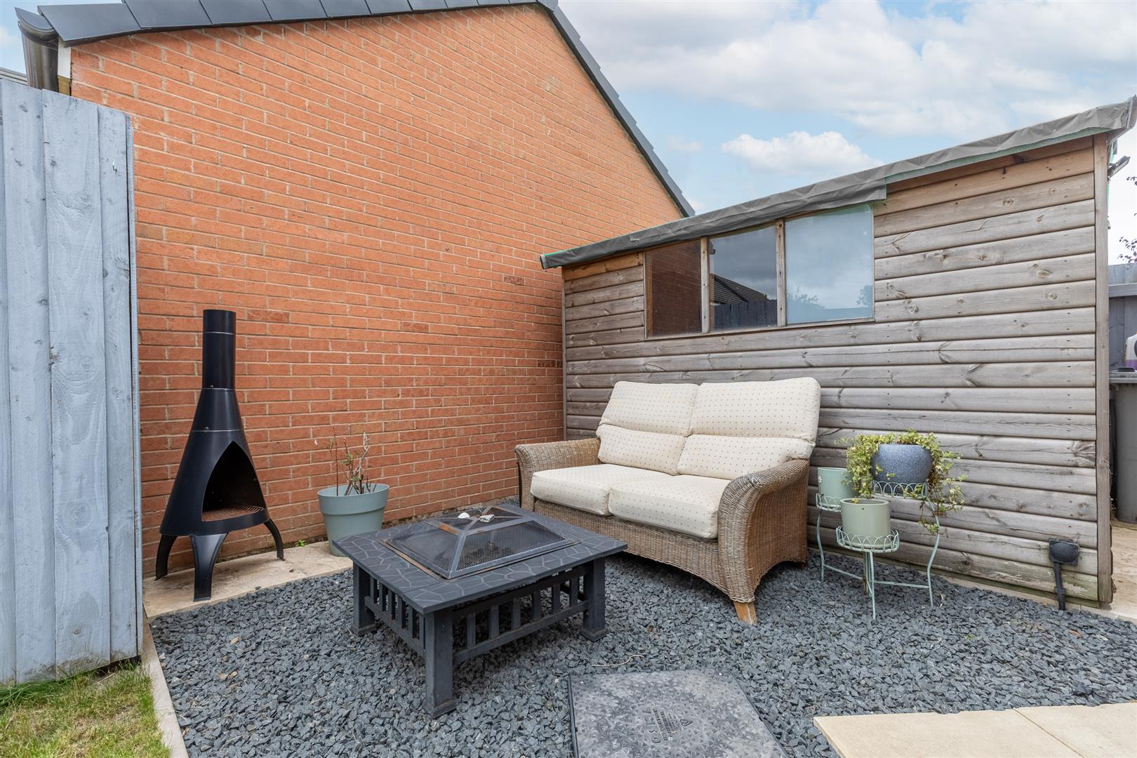 The rear garden is south-west facing and includes a lawn with fenced and herbaceous borders, a gravelled seating area to the side, and a shed with power and lighting. Gated side access leads to the front of the property.