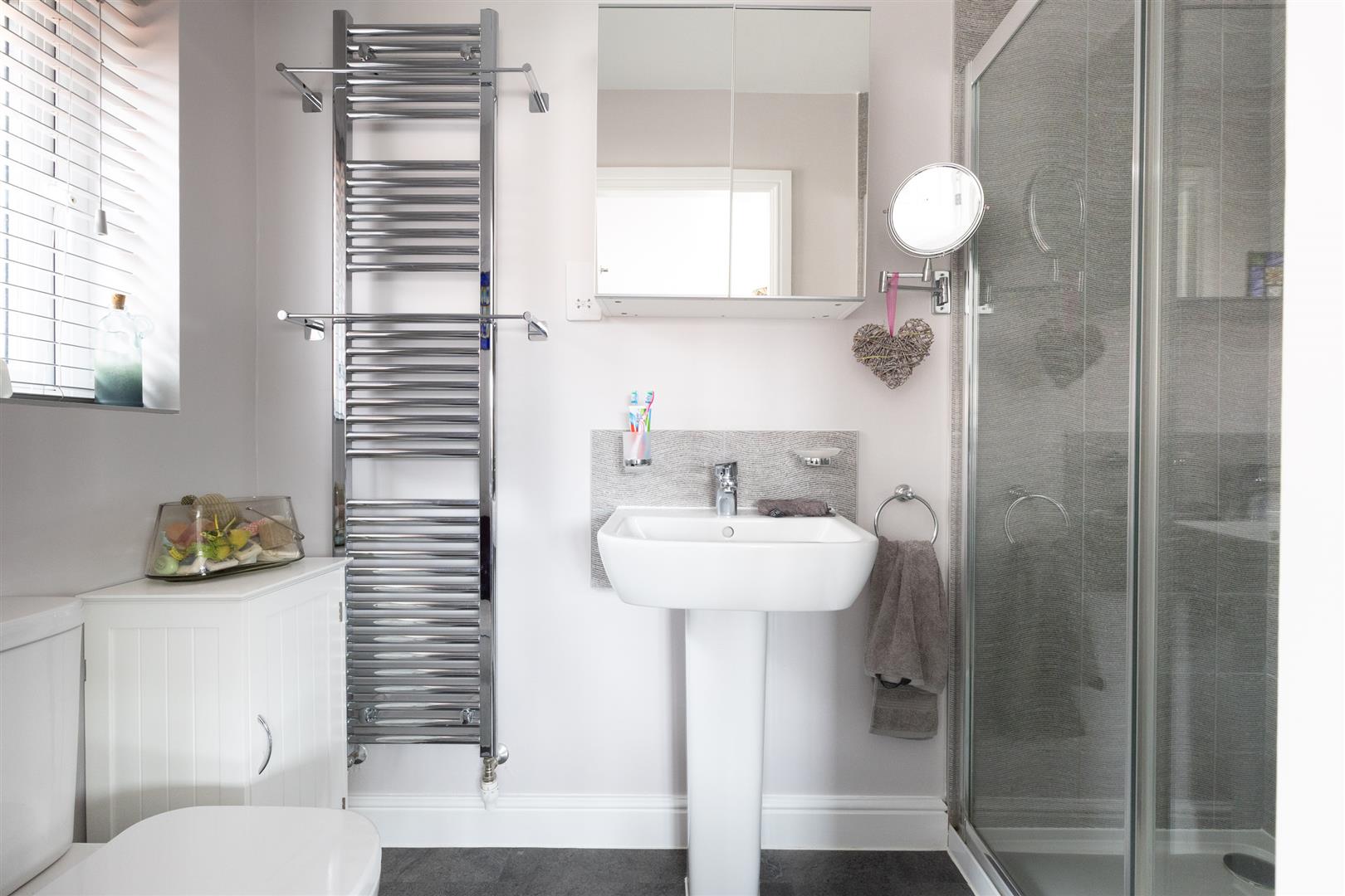 Walk in shower with fully tiled walls, mains shower and sliding doors. Low level WC, pedestal wash hand basin with splash back, recessed ceiling spotlights, chrome ladder radiator, towel rail.